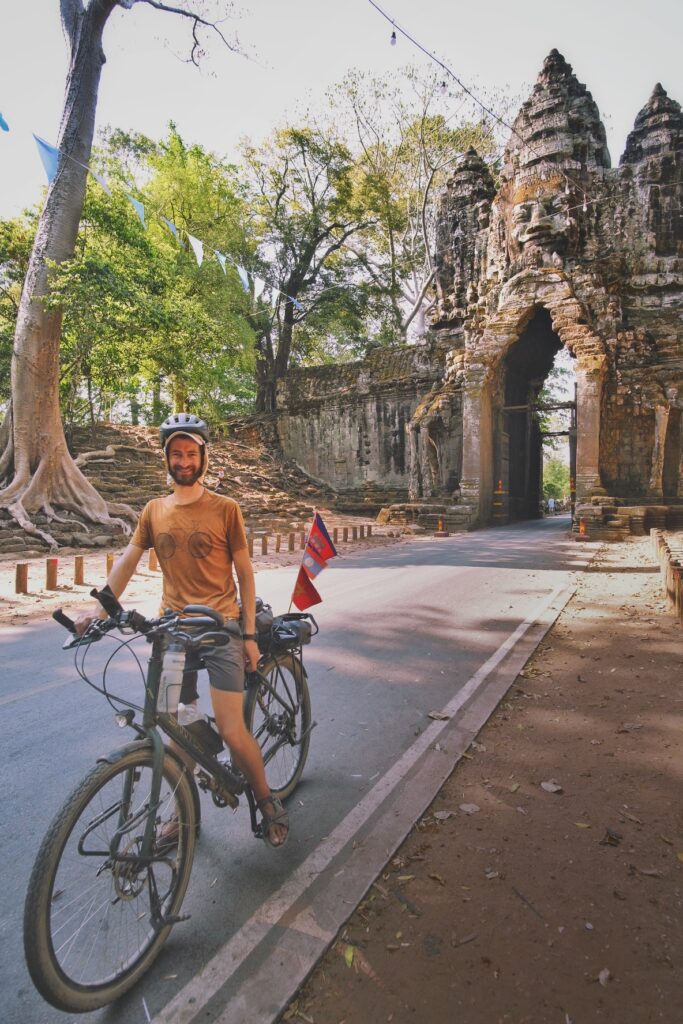 Cambodia is the only country in the world to have one building on its national flag and that is Angkor Wat. Angkor Wat is actually just one temple, but it stands in the middle of the largest religious complex in the world. It covers more than 400km² with over 1,000 archaeological sites. It is the former capital of the Khmer Empire (also known as the Angkor Empire). It was built in the 12th century and took 30 years to construct by 300,000 workers and 6,000 elephants. No machines were used. We explore part of the complex by bike, starting at sunrise at Angkor Wat. After 50km we finish at sunset at Bayon Temple. Despite the many tourists, it remains a magical and unimaginable place where the jungle has reclaimed some of the temples. Below is a short photo report: