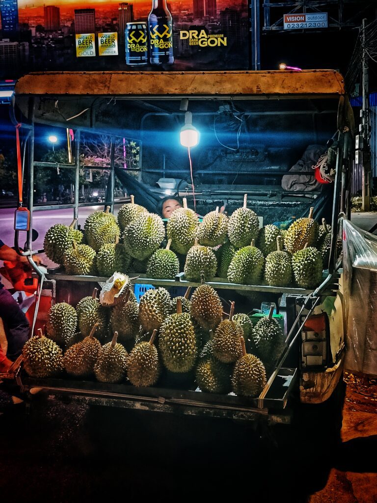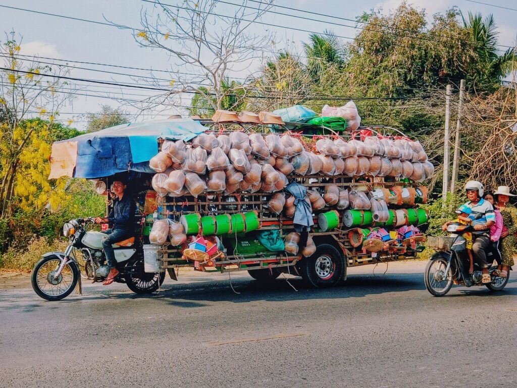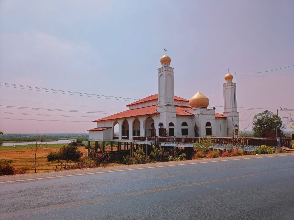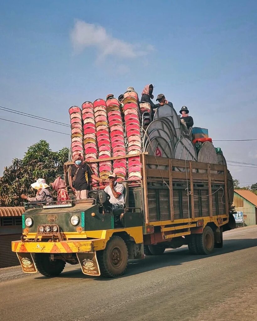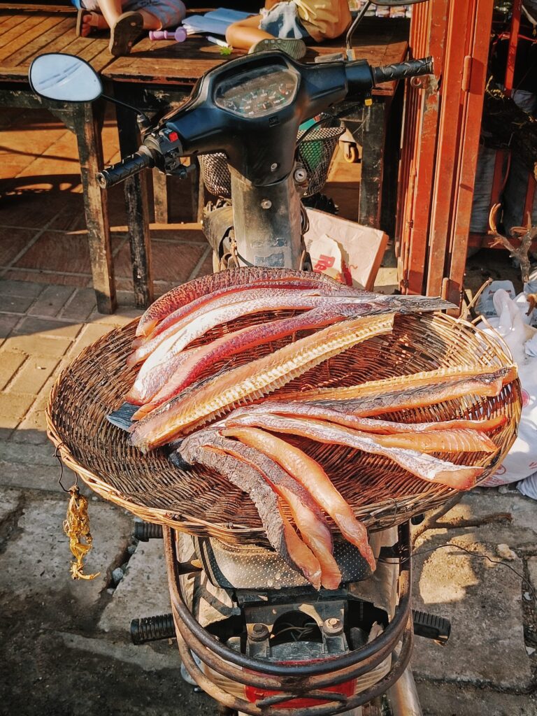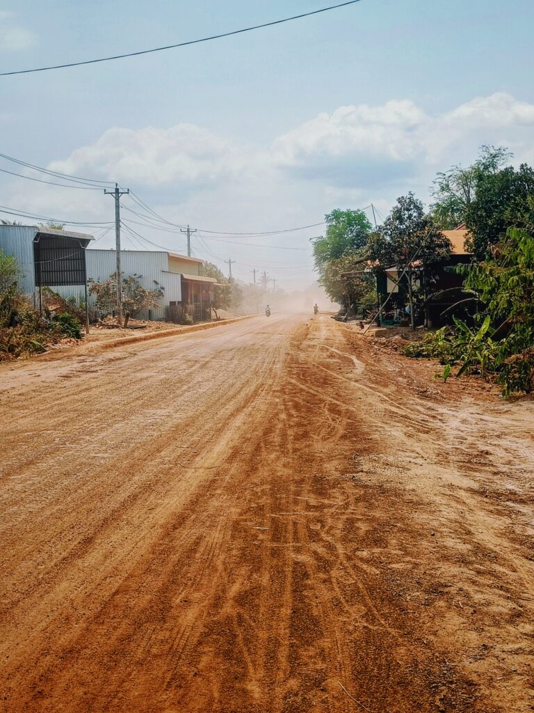 In Cambodia the roads are hot, dusty, straight and often with a monotonous and dry landscape. But it is on these days that we notice certain things along the roadside even more. Like fresh meat or fish hanging out to dry in the sun, the fact that it is normal to wear pyjamas to work or when shopping, constructions and creations on and by the roadside, and the exaggerated advertising of so-called ‘German’ beer. How suddenly several mosques appear in the landscape and how weddings are celebrated literally in the middle of dusty roads, with marquees and all, while traffic passes around them. The music is playing and the loudspeakers are blaring from the many huge birdhouses that are being grown for the Chinese market. But there were also fruits and nuts hanging from the trees, grown by the farmers, such as cashews and mangoes. Yes, it’s on this trip!