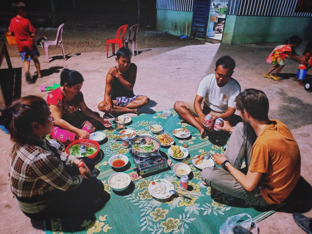The man points out that we can take a shower with cold water and a pan. This is outside in a separate corrugated iron shed. Later, Eloy tells us that he got an electric shock while washing his hair and hit his head on a loose light bulb. People are much smaller than Eloy in Cambodia, so Audrey showers in the neighbour’s shed and is joined by a large cockroach that she cannot take her eyes off while she takes a shower. Then a sort of carpet is laid out in front of the house and several relatives, including grandparents, from different houses squeeze in. We share the bread and meat sticks we bought at the petrol station, and a large pot of stock is put on a gas burner. Meat and vegetables are added and eaten with rice. They teach us a few words of Khmer (the local language) and the 2 year old daughter tries her hand at English all evening. At 9pm everyone goes inside and we enter the tent. We lie on the driveway next to the road and the traffic almost seems to drive into the tent. Despite the mosquitoes we have to leave the tent open as it is still 30 degrees and bloody hot. We often cannot imagine how people can live in this climate. Meanwhile, we also take our malaria tablets, as apart from dengue fever, malaria can also occur in this region.