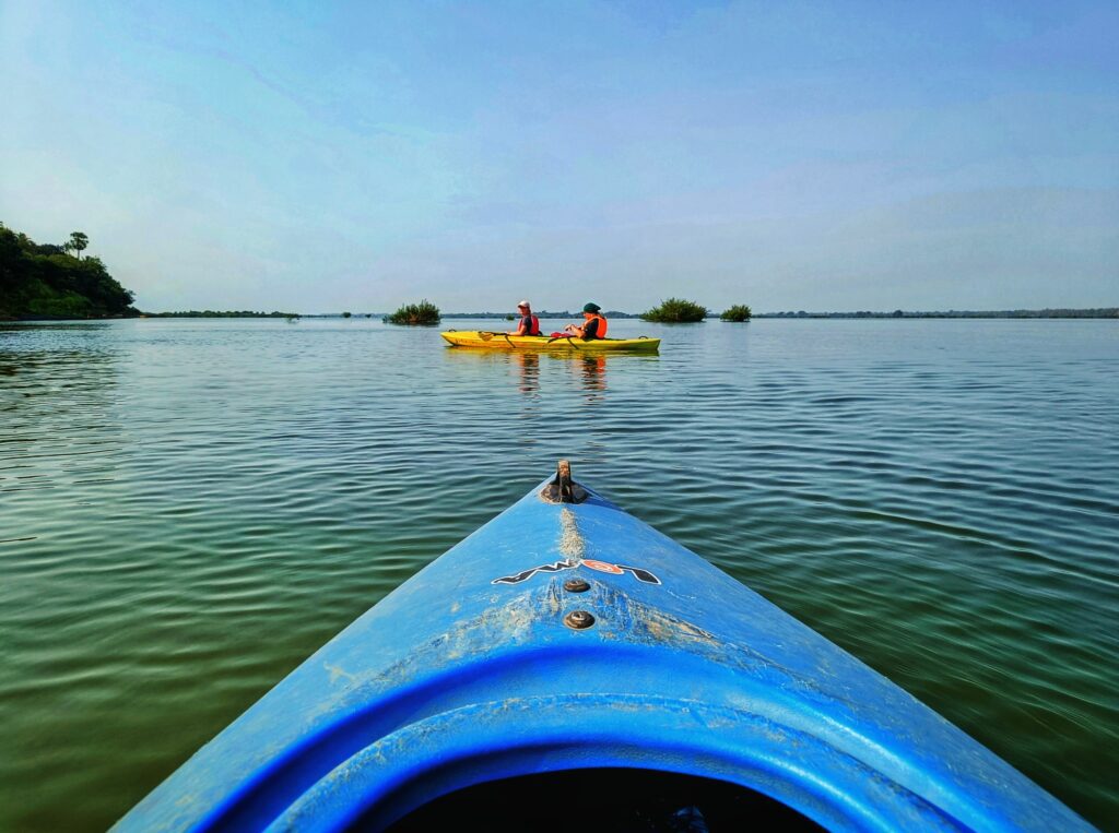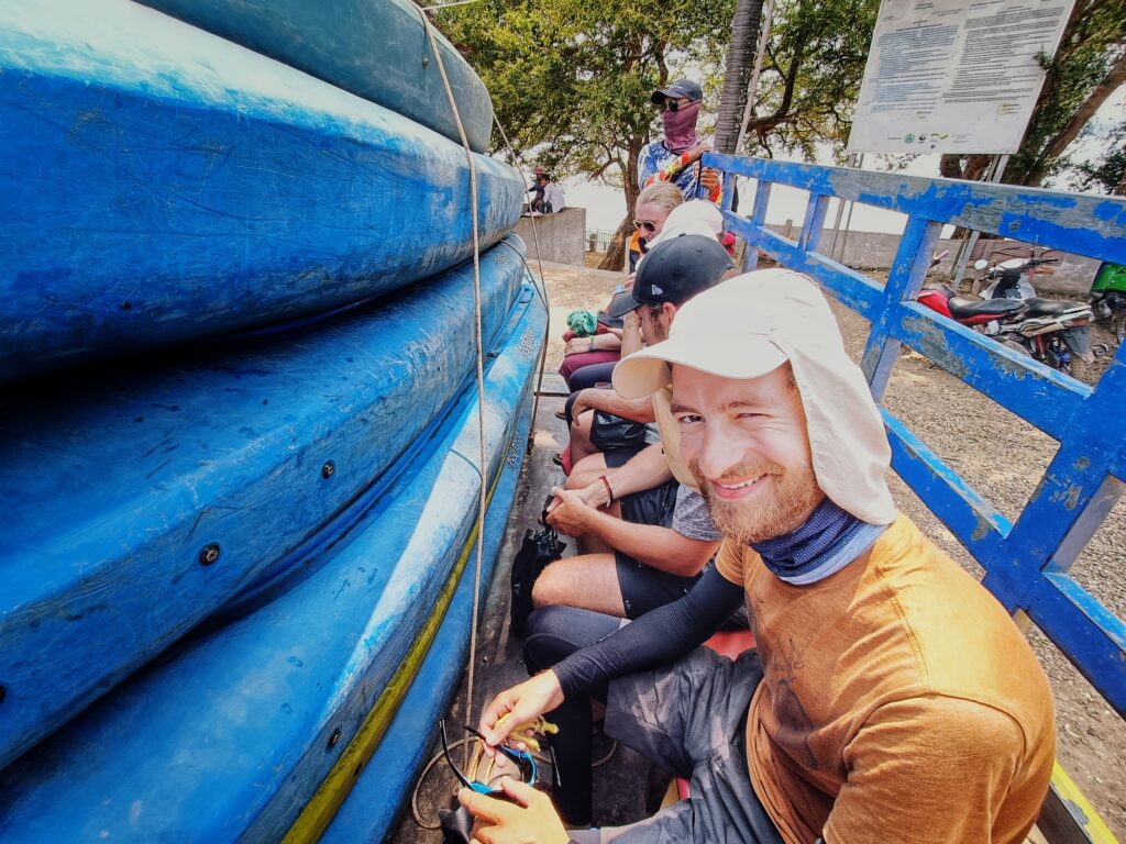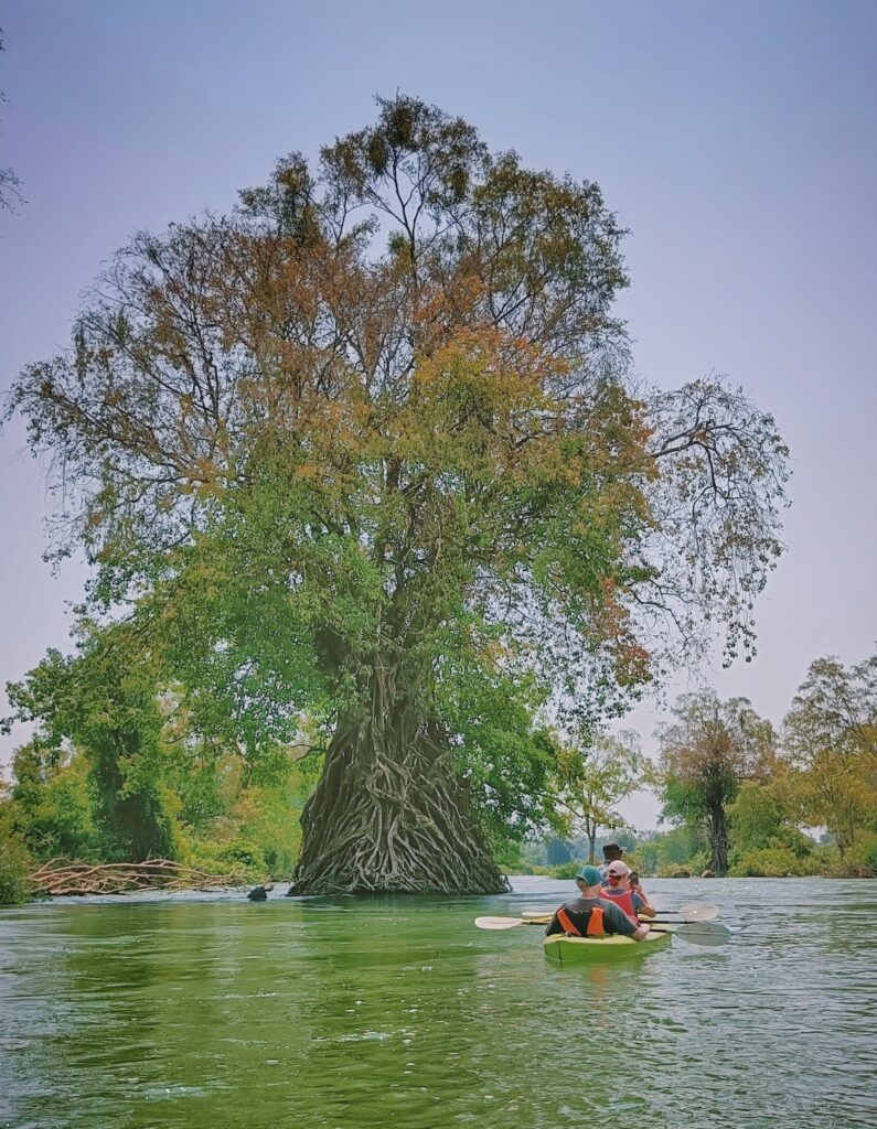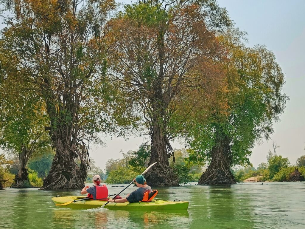 We had never heard of them before we came to Cambodia! Today we swap our bikes for kayaks in an attempt to see river dolphins in the Mekong. We pile into the back of a pickup truck with the kayaks and head upstream on the same bumpy road we cycled yesterday. The Irrawaddy dolphins are unfortunately critically endangered. There are less than 90 adult dolphins left in this part of the Mekong. The main threats to their survival are fishing nets, fishing explosives, dams and other human activities. The stretch of river between Laos and Kratié is also known as the ‘Mekong Flooded Forest Area’ and is home to enormous biodiversity. It is one of 35 areas worldwide on the WWF (World Wide Fund for Nature) priority list. At present, this part of the river is monitored by wardens and certain fishing practices are banned. However, our guide tells us that during Covid-19 the priorities were elsewhere and this did not help the dolphins. We did not take any photos of the dolphins (one from Google below), but we were able to see and hear a few. And luckily we are not tandem bikers, because kayaking together was still a challenge for a while!