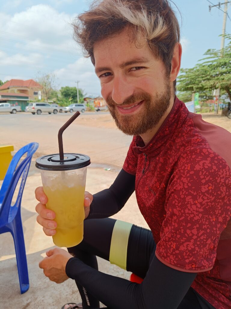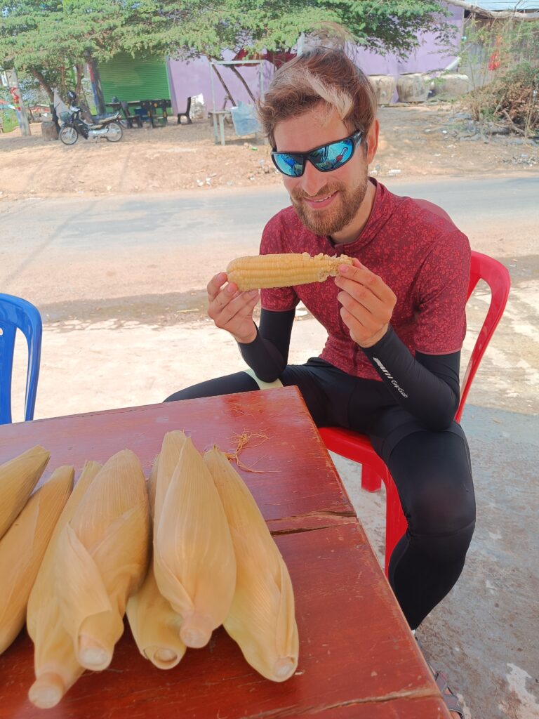 After saying goodbye to Attila, we cycle towards the Thai border in 2 days. The heat is getting unbearable and the hottest month in South East Asia is approaching. Fortunately, there are plenty of stalls selling fruit and ice-cream shakes. Sugar cane juice is our favourite, but with ice cubes, which you can’t always trust, but it’s necessary to cool down. Corn on the cob always goes down too, and we leave the chicken feet to one side.