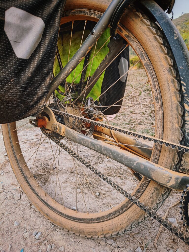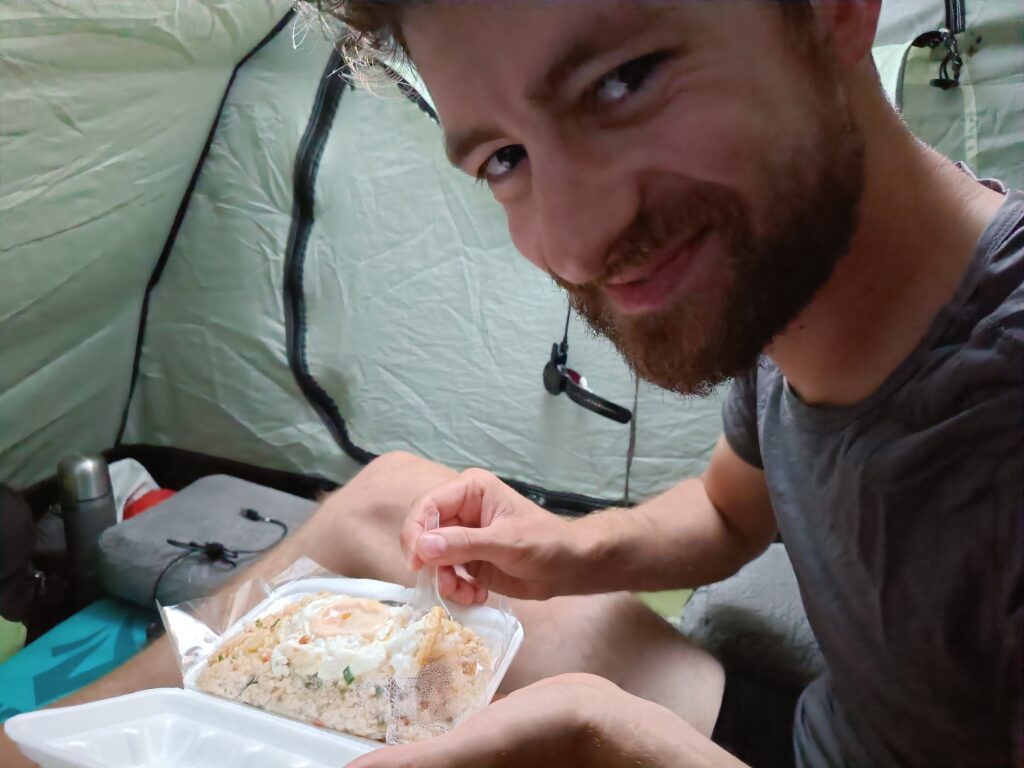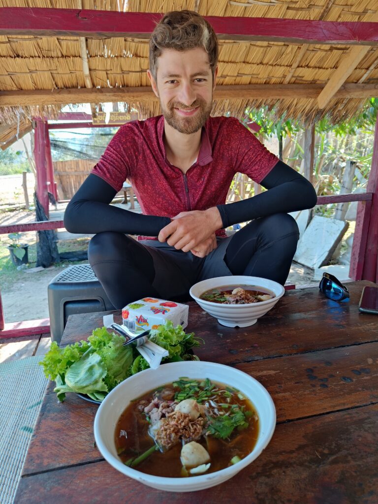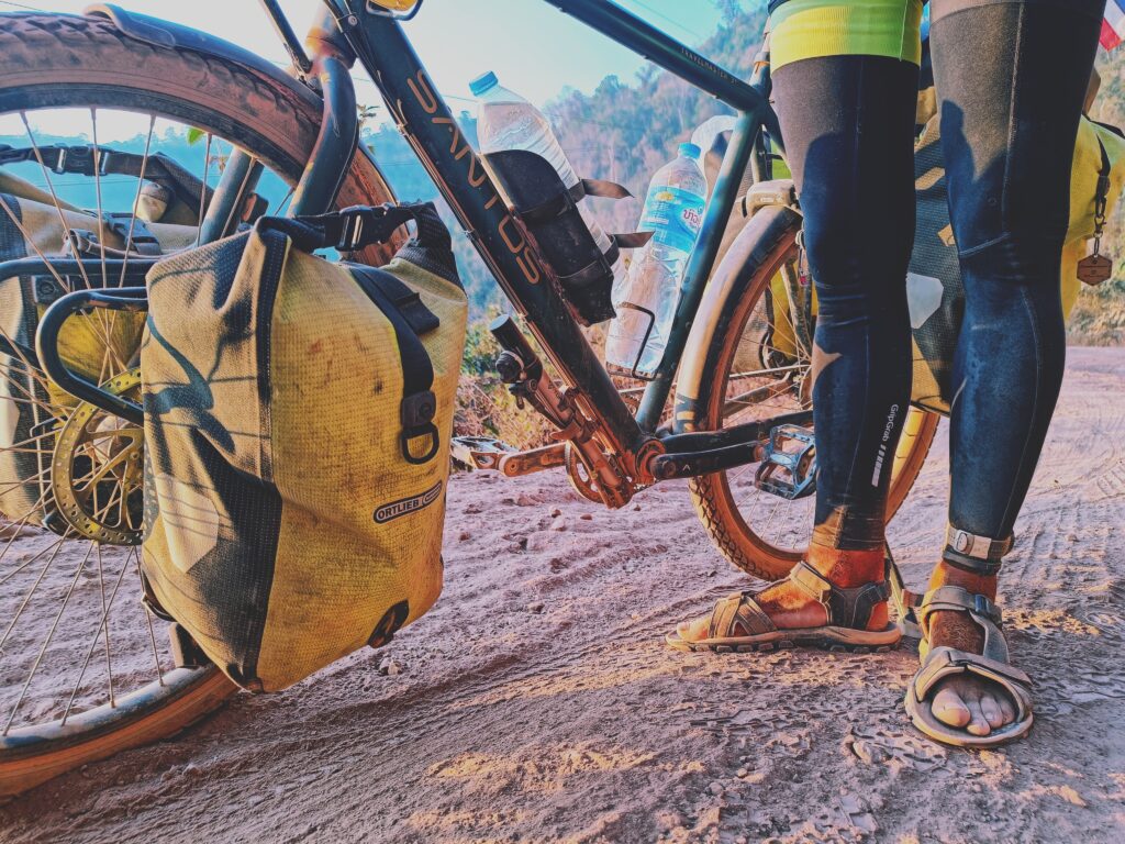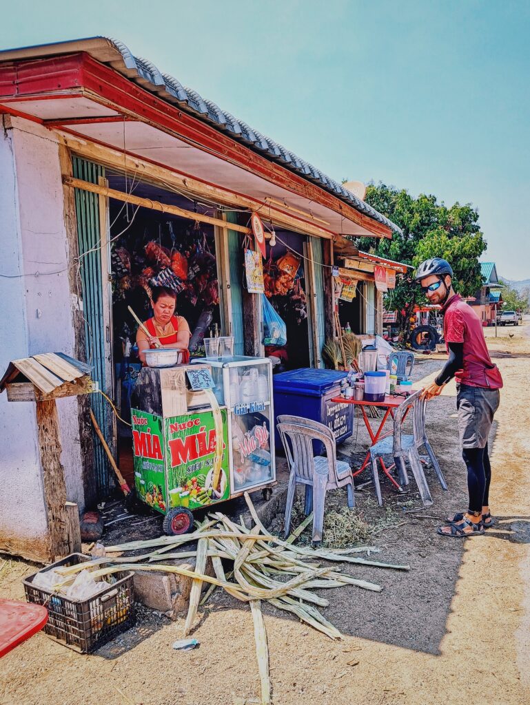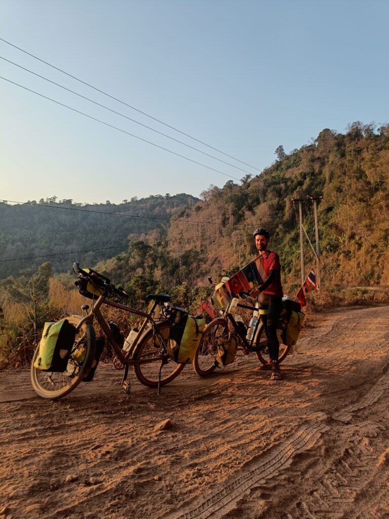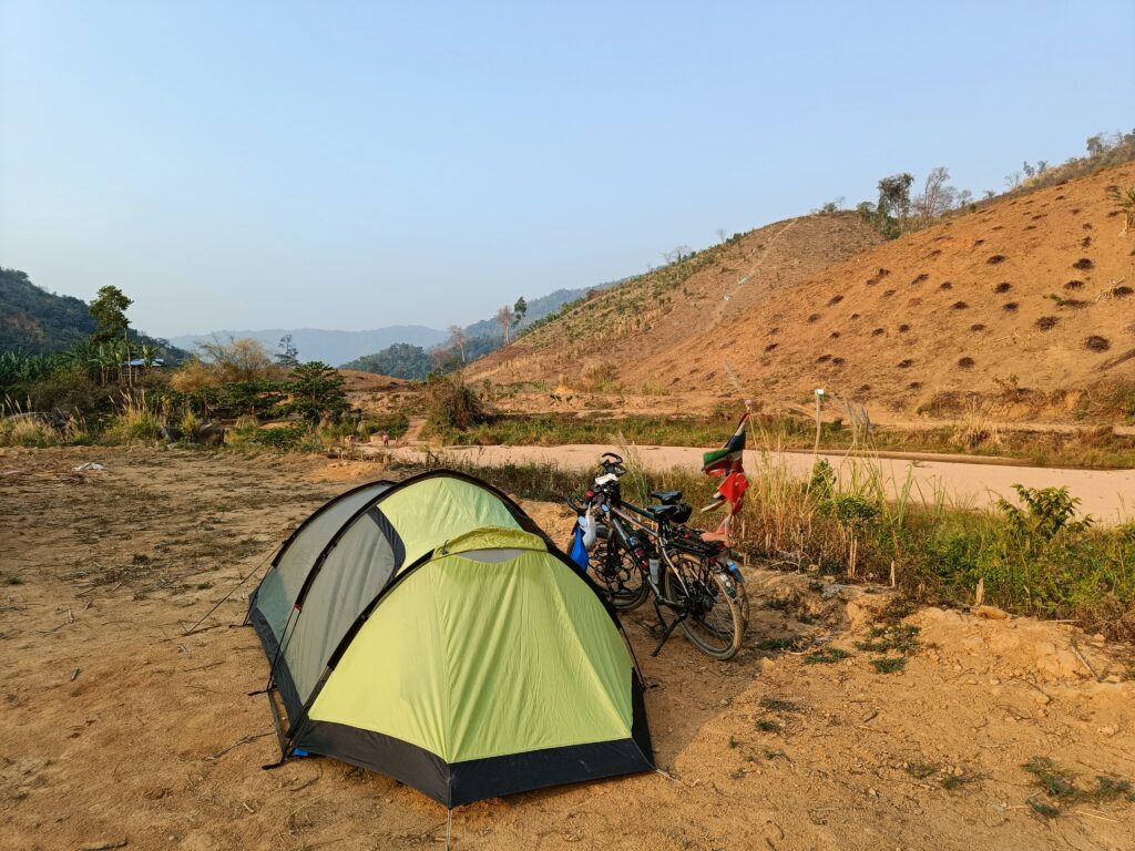 Eloy still has a stomach ache and diarrhoea in the morning, but he is convinced that we will be fine and that we need to move on as there is nothing here. With considerably less energy we slowly zigzag our way up the mountains. We only pass through very small villages with wooden houses, where the women often work on a wooden loom. Towards the end of the day we realised that we were not going to make it to the last mountain and decided to find somewhere to camp as there were no guesthouses nearby. We were also running out of water. Suddenly, we pass a group of Thai tourists in their pick-ups at the side of the road. They are enthusiastic and out of the blue give us water, cans of Fanta and bags of spicy Thai instant noodles to cook later.) We are more than grateful and surprised that certain ‘problems’ can solve themselves unexpectedly. Suddenly we have water again. We cycle a bit further and set up camp on a (rare!) flat stretch, a bit sheltered from the road, behind a small hill. We quickly cooked the instant noodles with only 1/5 of the sauce, otherwise it would be too spicy. We are so incredibly dirty and dusty and sticky with sweat, but there is no point in worrying about that now. We are tuckered out and asleep by 8pm. Around midnight we are up again. Eloy’s intestines still can’t process the noodles and he storms out of the tent just in time. He also has a fever now, but with some medication he seems to be able to sleep quite well afterwards. We decide to try a bit of hitchhiking the next morning.