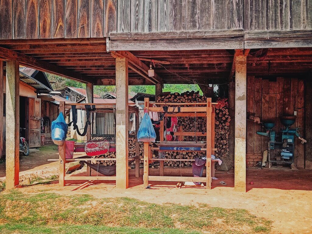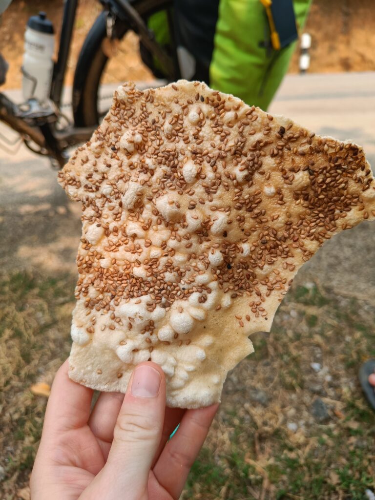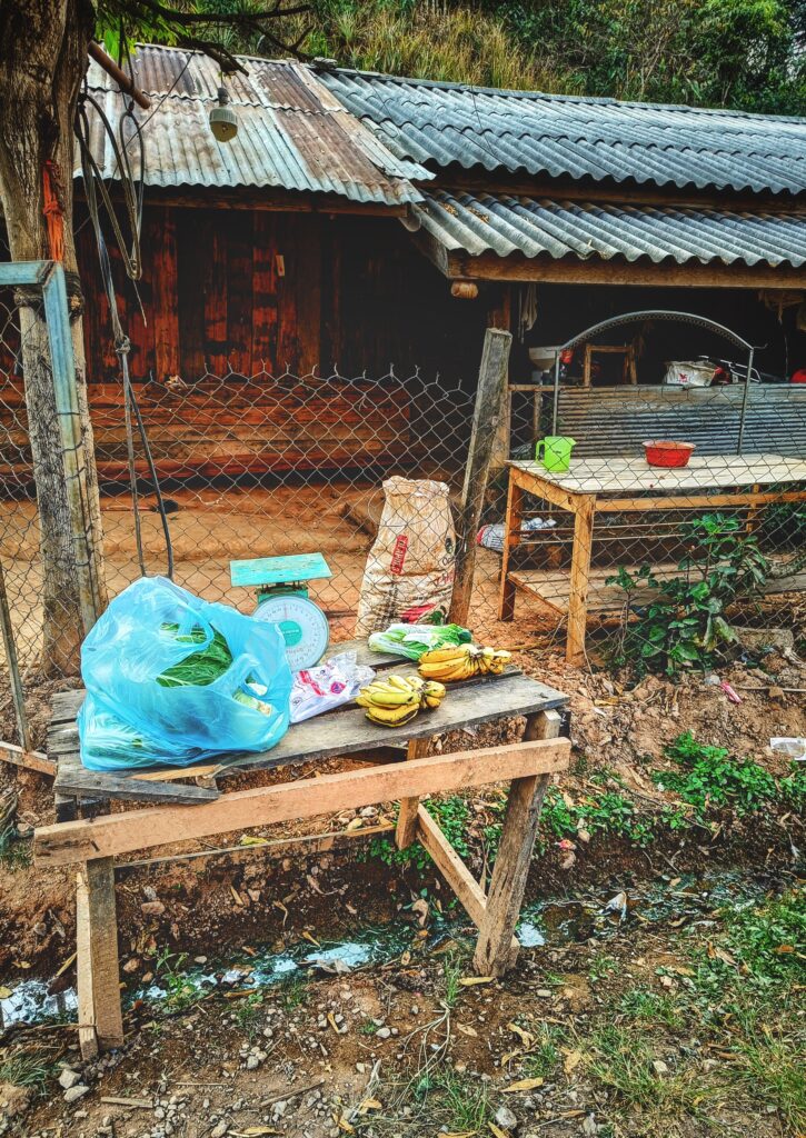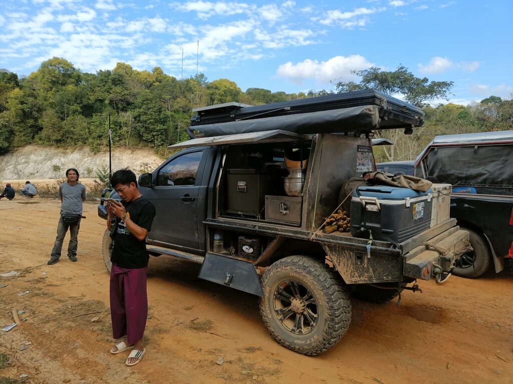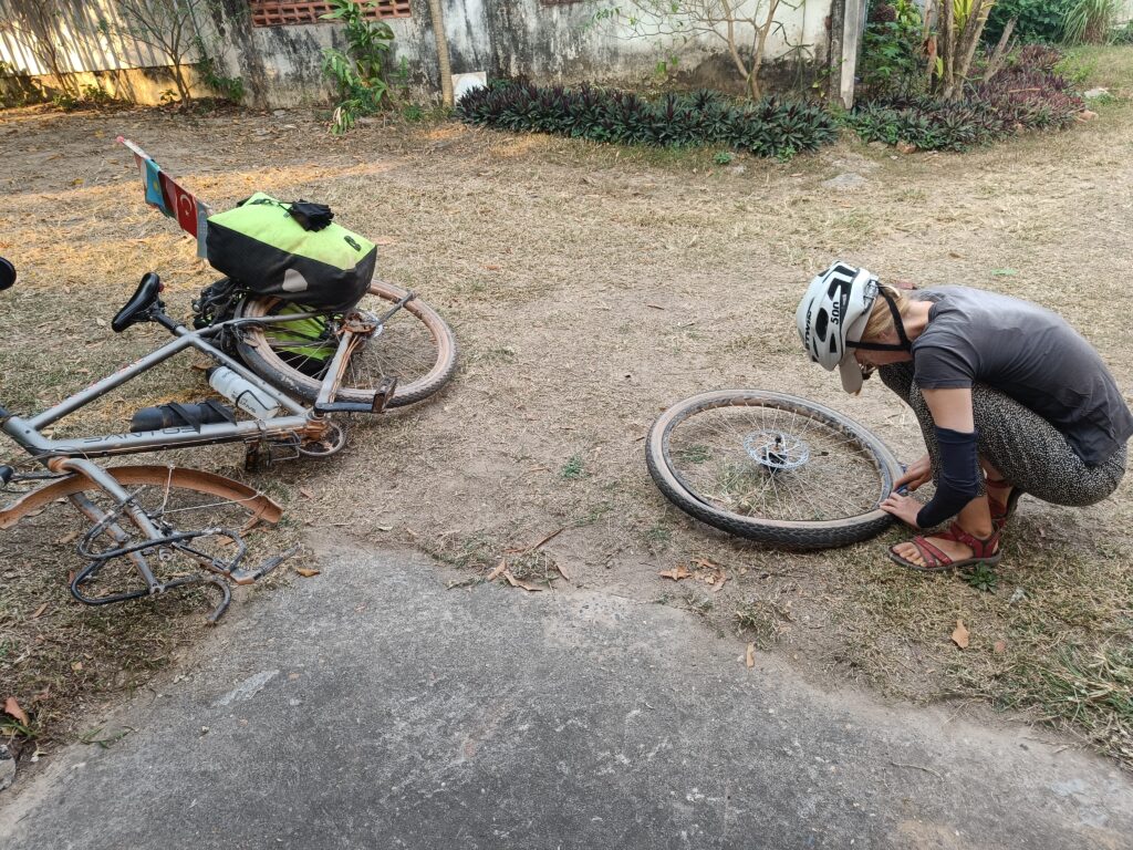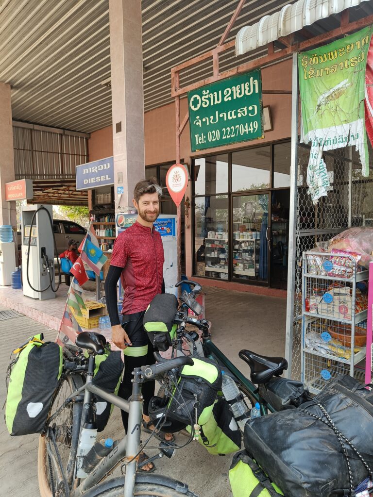 Eloy still has a stomach ache and diarrhoea in the morning, but he is convinced that we will be fine and that we need to move on as there is nothing here. With considerably less energy we slowly zigzag our way up the mountains. We only pass through very small villages with wooden houses, where the women often work on a wooden loom. Towards the end of the day we realised that we were not going to make it to the last mountain and decided to find somewhere to camp as there were no guesthouses nearby. We were also running out of water. Suddenly, we pass a group of Thai tourists in their pick-ups at the side of the road. They are enthusiastic and out of the blue give us water, cans of Fanta and bags of spicy Thai instant noodles to cook later.) We are more than grateful and surprised that certain ‘problems’ can solve themselves unexpectedly. Suddenly we have water again. We cycle a bit further and set up camp on a (rare!) flat stretch, a bit sheltered from the road, behind a small hill. We quickly cooked the instant noodles with only 1/5 of the sauce, otherwise it would be too spicy. We are so incredibly dirty and dusty and sticky with sweat, but there is no point in worrying about that now. We are tuckered out and asleep by 8pm. Around midnight we are up again. Eloy’s intestines still can’t process the noodles and he storms out of the tent just in time. He also has a fever now, but with some medication he seems to be able to sleep quite well afterwards. We decide to try a bit of hitchhiking the next morning.