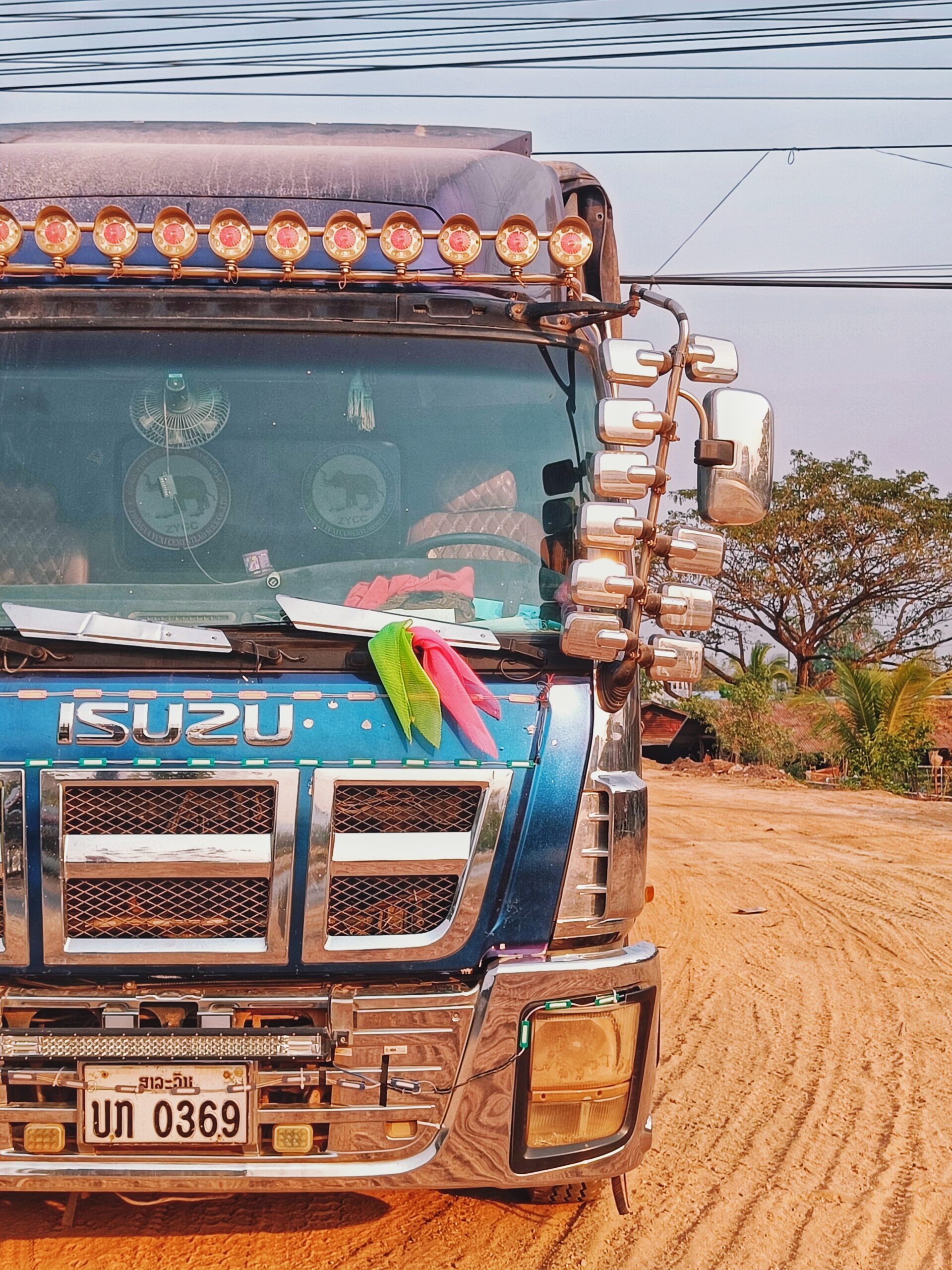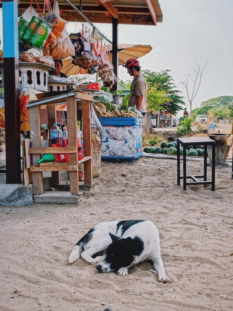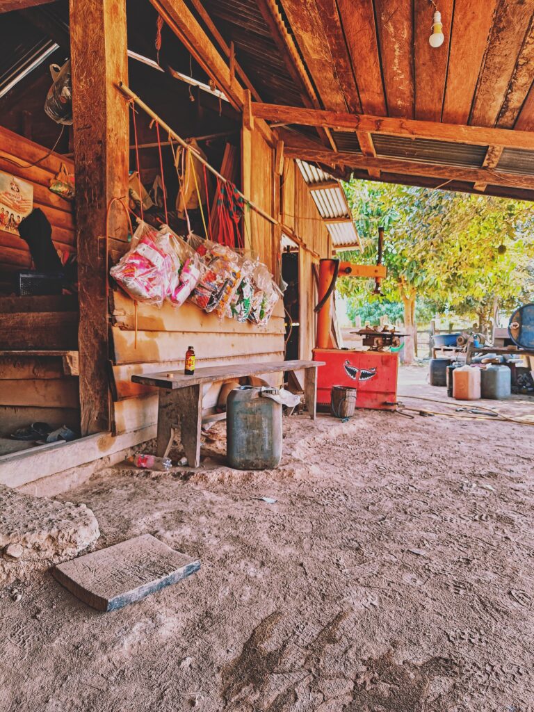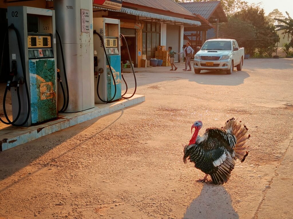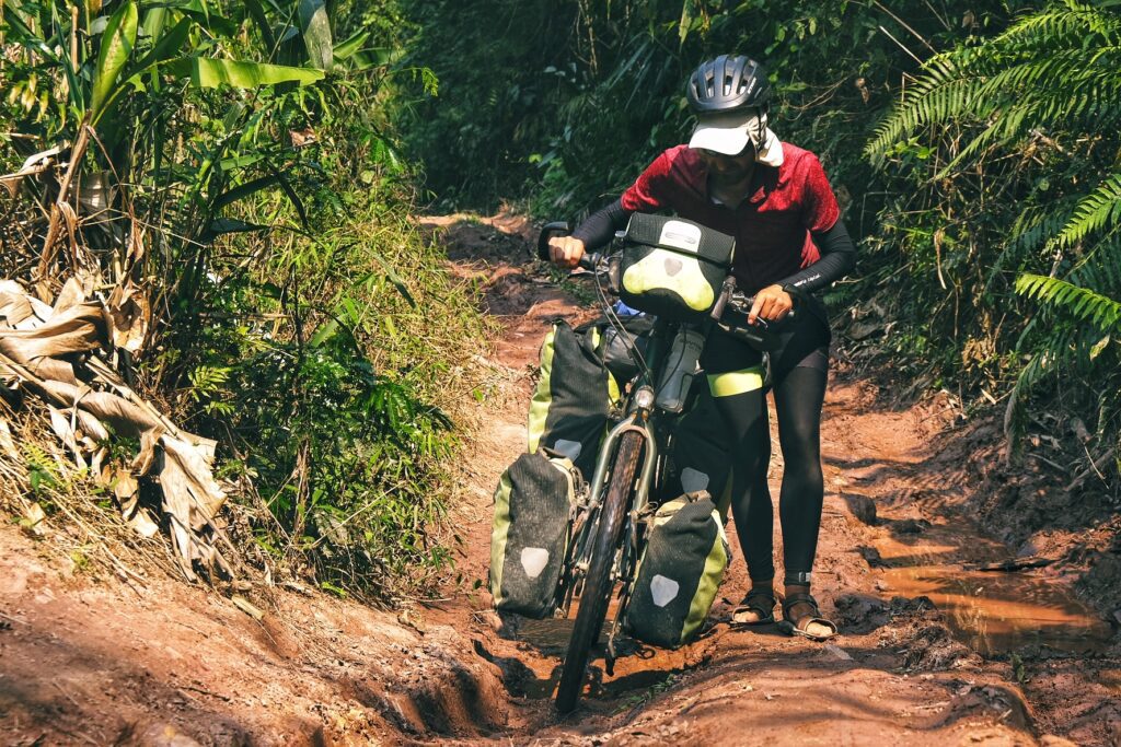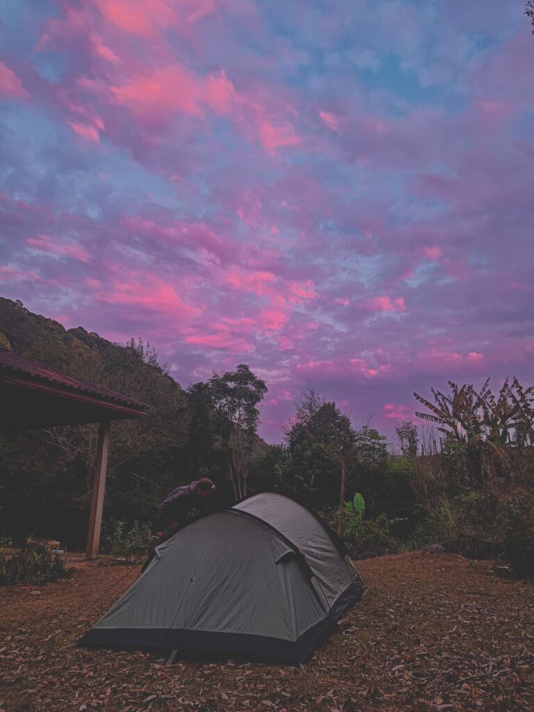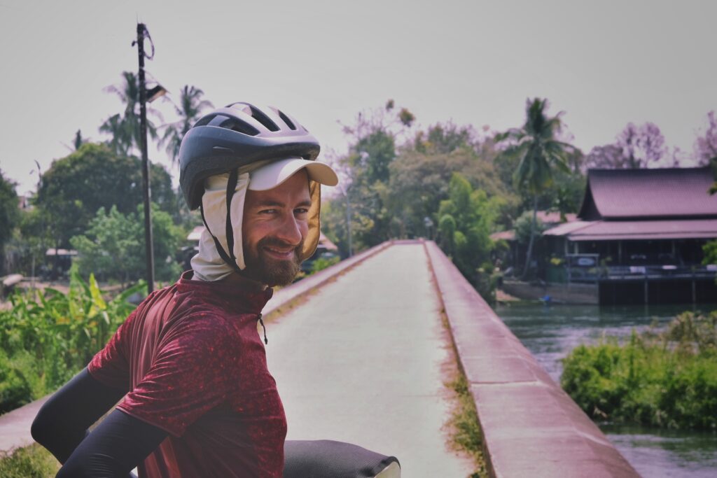 Eloy still has a stomach ache and diarrhoea in the morning, but he is convinced that we will be fine and that we need to move on as there is nothing here. With considerably less energy we slowly zigzag our way up the mountains. We only pass through very small villages with wooden houses, where the women often work on a wooden loom. Towards the end of the day we realised that we were not going to make it to the last mountain and decided to find somewhere to camp as there were no guesthouses nearby. We were also running out of water. Suddenly, we pass a group of Thai tourists in their pick-ups at the side of the road. They are enthusiastic and out of the blue give us water, cans of Fanta and bags of spicy Thai instant noodles to cook later.) We are more than grateful and surprised that certain ‘problems’ can solve themselves unexpectedly. Suddenly we have water again. We cycle a bit further and set up camp on a (rare!) flat stretch, a bit sheltered from the road, behind a small hill. We quickly cooked the instant noodles with only 1/5 of the sauce, otherwise it would be too spicy. We are so incredibly dirty and dusty and sticky with sweat, but there is no point in worrying about that now. We are tuckered out and asleep by 8pm. Around midnight we are up again. Eloy’s intestines still can’t process the noodles and he storms out of the tent just in time. He also has a fever now, but with some medication he seems to be able to sleep quite well afterwards. We decide to try a bit of hitchhiking the next morning.