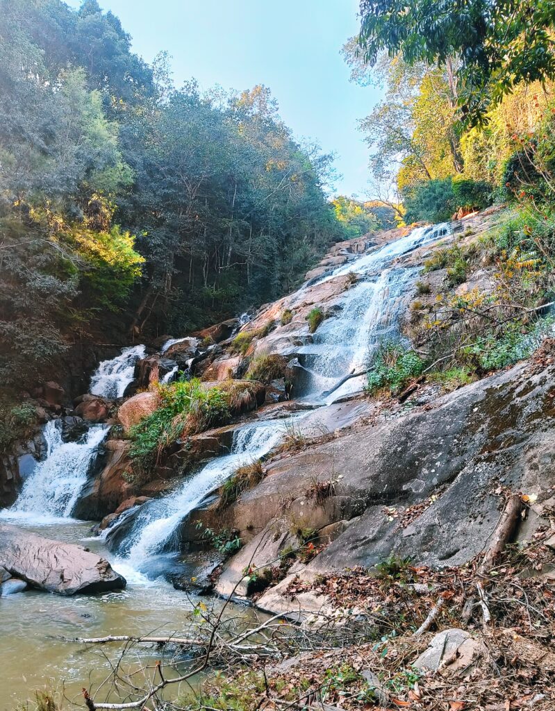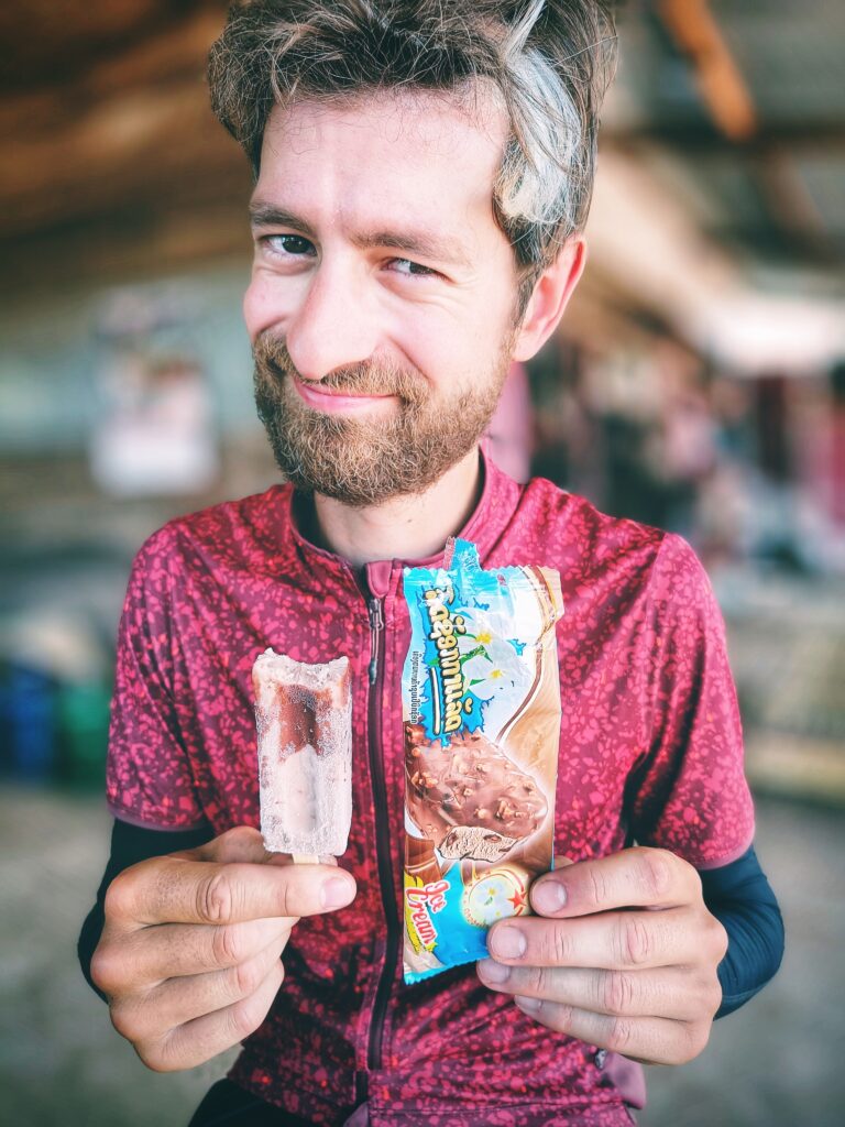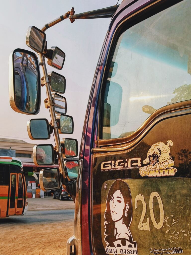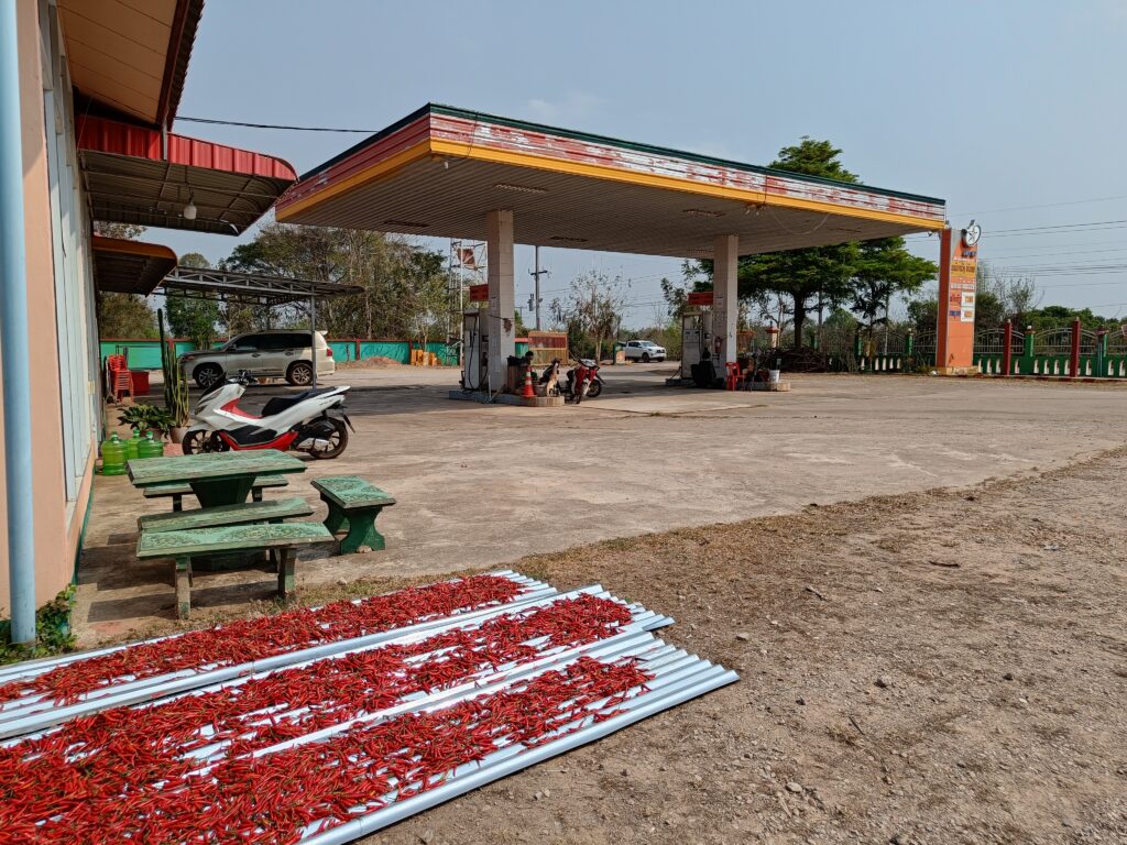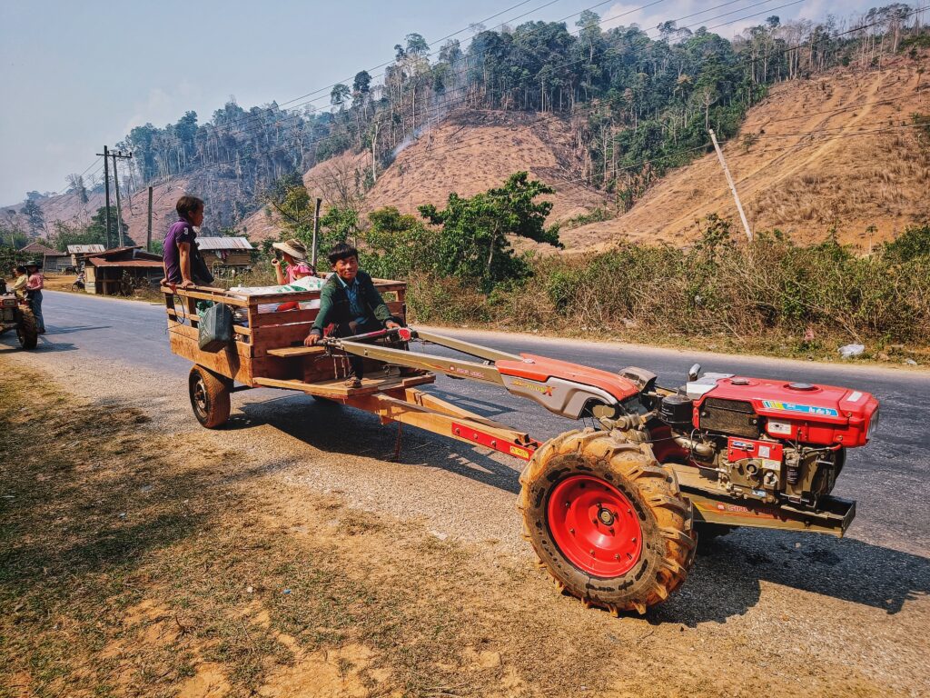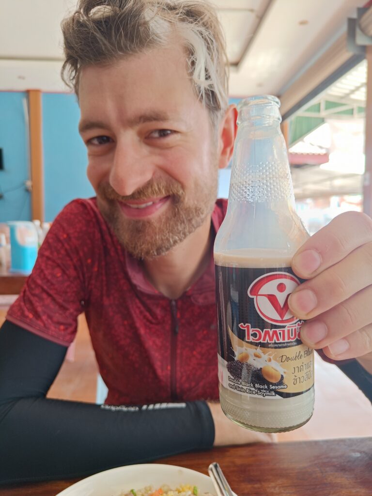 Eloy still has a stomach ache and diarrhoea in the morning, but he is convinced that we will be fine and that we need to move on as there is nothing here. With considerably less energy we slowly zigzag our way up the mountains. We only pass through very small villages with wooden houses, where the women often work on a wooden loom. Towards the end of the day we realised that we were not going to make it to the last mountain and decided to find somewhere to camp as there were no guesthouses nearby. We were also running out of water. Suddenly, we pass a group of Thai tourists in their pick-ups at the side of the road. They are enthusiastic and out of the blue give us water, cans of Fanta and bags of spicy Thai instant noodles to cook later.) We are more than grateful and surprised that certain ‘problems’ can solve themselves unexpectedly. Suddenly we have water again. We cycle a bit further and set up camp on a (rare!) flat stretch, a bit sheltered from the road, behind a small hill. We quickly cooked the instant noodles with only 1/5 of the sauce, otherwise it would be too spicy. We are so incredibly dirty and dusty and sticky with sweat, but there is no point in worrying about that now. We are tuckered out and asleep by 8pm. Around midnight we are up again. Eloy’s intestines still can’t process the noodles and he storms out of the tent just in time. He also has a fever now, but with some medication he seems to be able to sleep quite well afterwards. We decide to try a bit of hitchhiking the next morning.