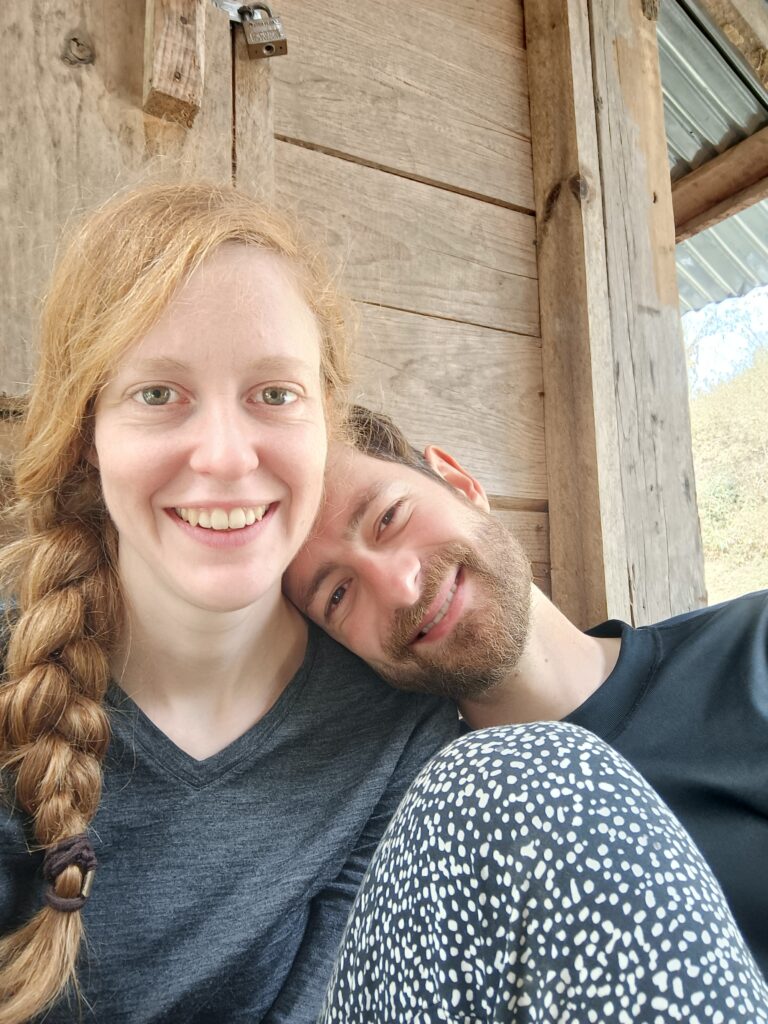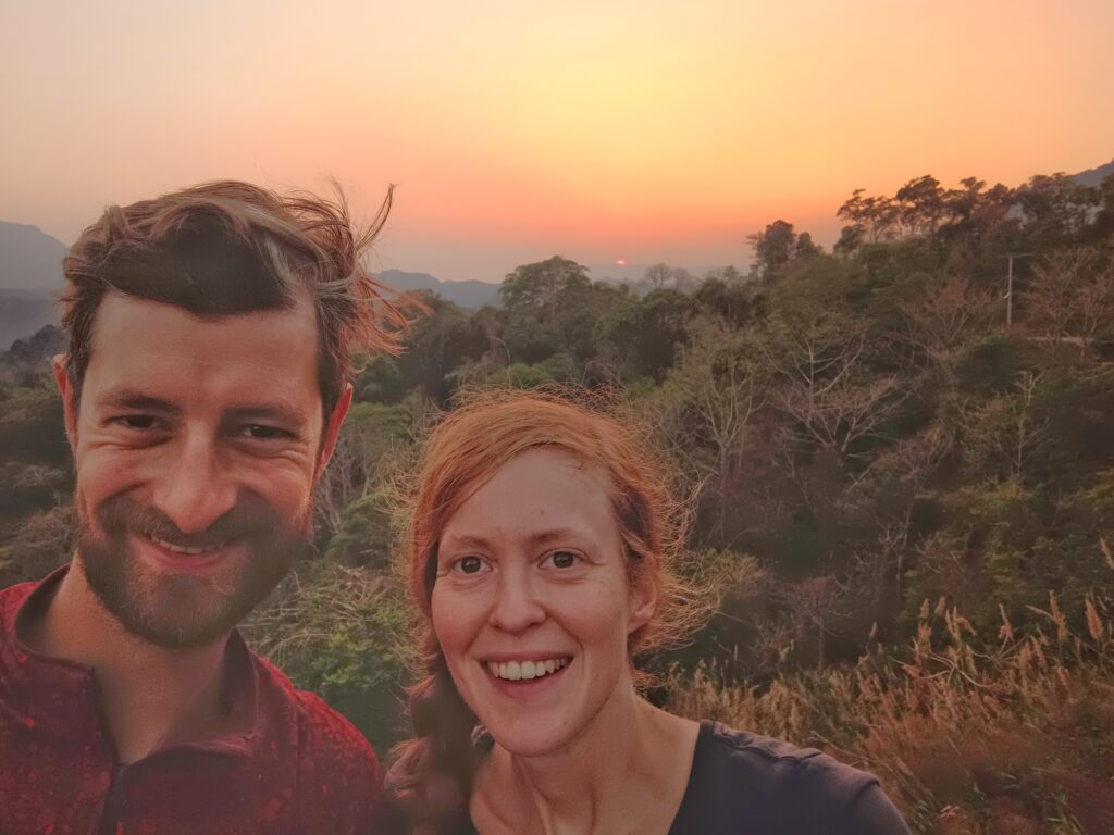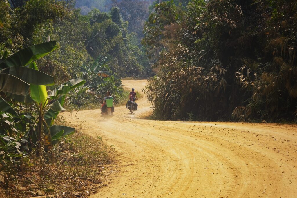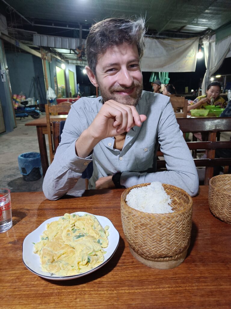 Then we leave the sealed road and head south. Immediately we find ourselves on a steep dirt track, and when the sweat starts to trickle down our foreheads after a few hundred metres, we start to question everything. The rest of the day we struggle through 10cm of sand, over rocks, through a river, past still smoldering bits of land and several times we have to push the bike through the washed-out ‘road’. We pass several huts and people working on their land. Sometimes we are stared at as if we were from another planet, but this is soon followed by an enthusiastic and smiling ‘Sabaidee! Totally exhausted, we arrive in a small village at the end of the day. We found a guesthouse without a shower. The family tells us that we can shower inside as we have turned into 2 orange oranges. Everything is covered in orange sand and dust. Later, when we have dinner at the restaurant down the road, we try to order something based on photos. An omelette with sticky rice and a soup. The omelette turns out to be full of chillies and where Eloy gets hot, Audrey only notices it after the third bite and then goes over the top 😉