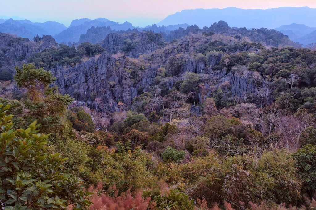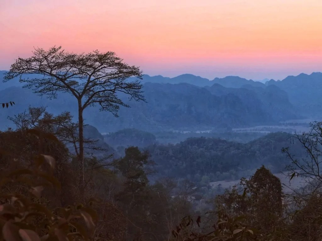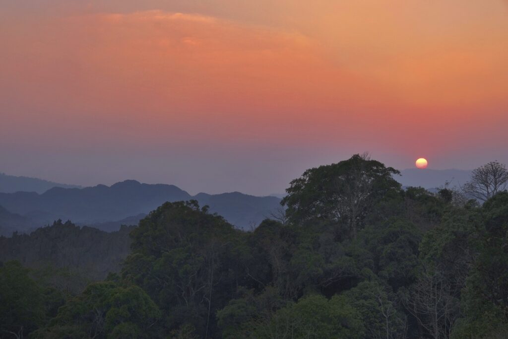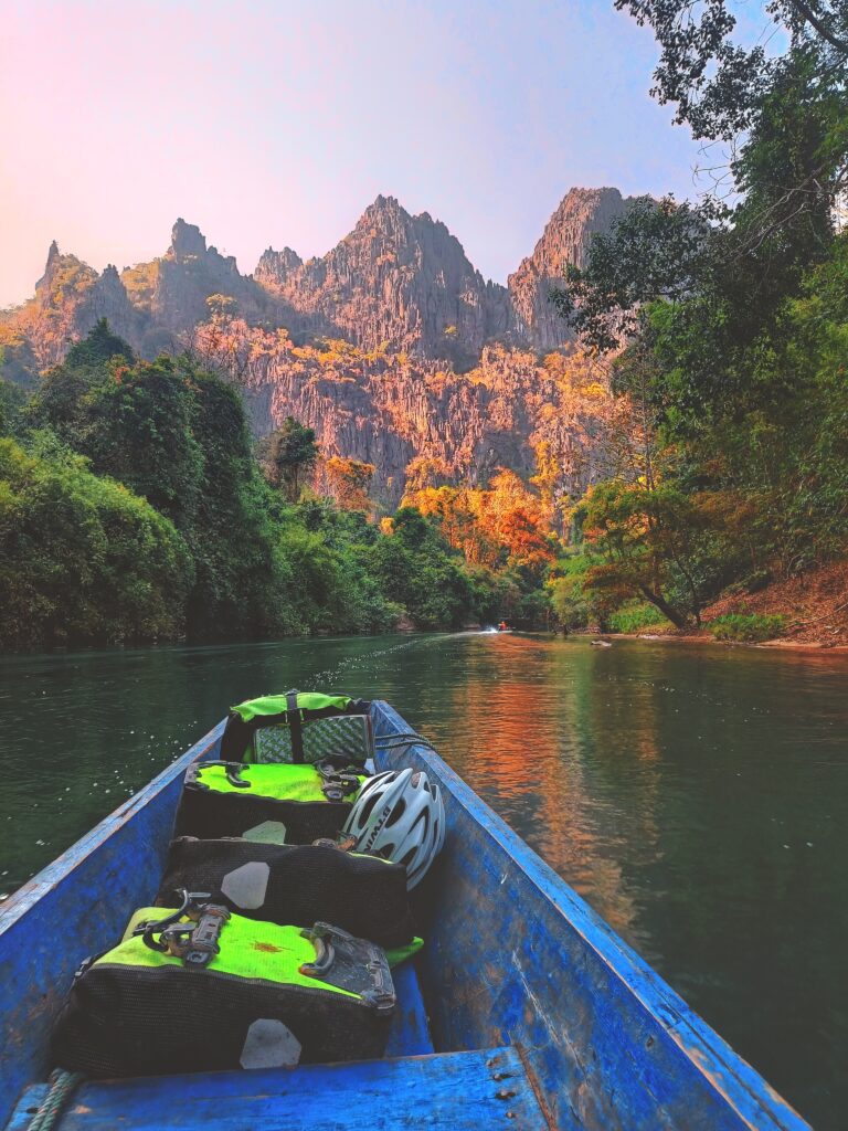After a couple of days on the busy main road, we turn off to cycle part of the Thakhek Loop. The scenery is dazzling and after a day of cycling we arrive just in time to watch the sunset from a mountaintop viewpoint: ‘Rock Viewpoint’. Where history meets the present: an ancient limestone mountain range.