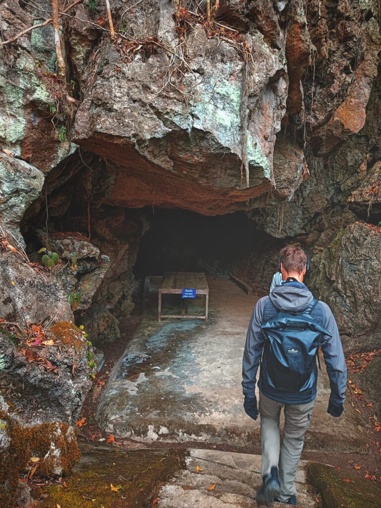 In Vieng Xai we have breakfast with an Indian man who has lived in Laos for a long time. Then we cycle to some nearby caves. With an English audio guide, we cycle past some of the sites to learn more about Laos’ gruesome war history. A few weeks ago, on our first visit to Laos, we visited the UXO Visitor Centre in Luang Prabang. About how US (cluster) bombs are still causing casualties from unexploded ordnance every day. As we cycle to the first cave, a guide is waiting for us. We are the only ones and he tells us even more than the audio guide. We enter 5 caves where, between 1964 and 1973, the communist Pathet Lao fought for an independent communist Laos and lived alongside tens of thousands of local people. Due to the Cold War and fear of Russian influence, the US tried to stop communism in Vietnam. This is better known to us as the ‘Vietnam War’. At the same time, a secret war against communism was being waged in Laos, using more bombs than were dropped in Europe during the Second World War (also known as the ‘Secret War’)! Sadly, this made Laos the most bombed nation in history. For nine years (!) the Laotian people were besieged 24 hours a day, every 8 minutes (!) with a plane full of bombs. The people lived in darkness, in caves equipped with a hospital, a school and even a theatre. Airtight rooms were built for fear of chemical bombs. People cooked after dark, and work in the fields to provide food was done at night. Animals, such as chickens, had to be killed. Aircraft pilots were instructed to drop bombs where chickens roamed – a sign of life. Innocent life. Around the caves you can still see many large craters from the bombs that fell here, and the red-purple flowers represent the bloodshed that took place here. War is NEVER the answer! 🕊️
