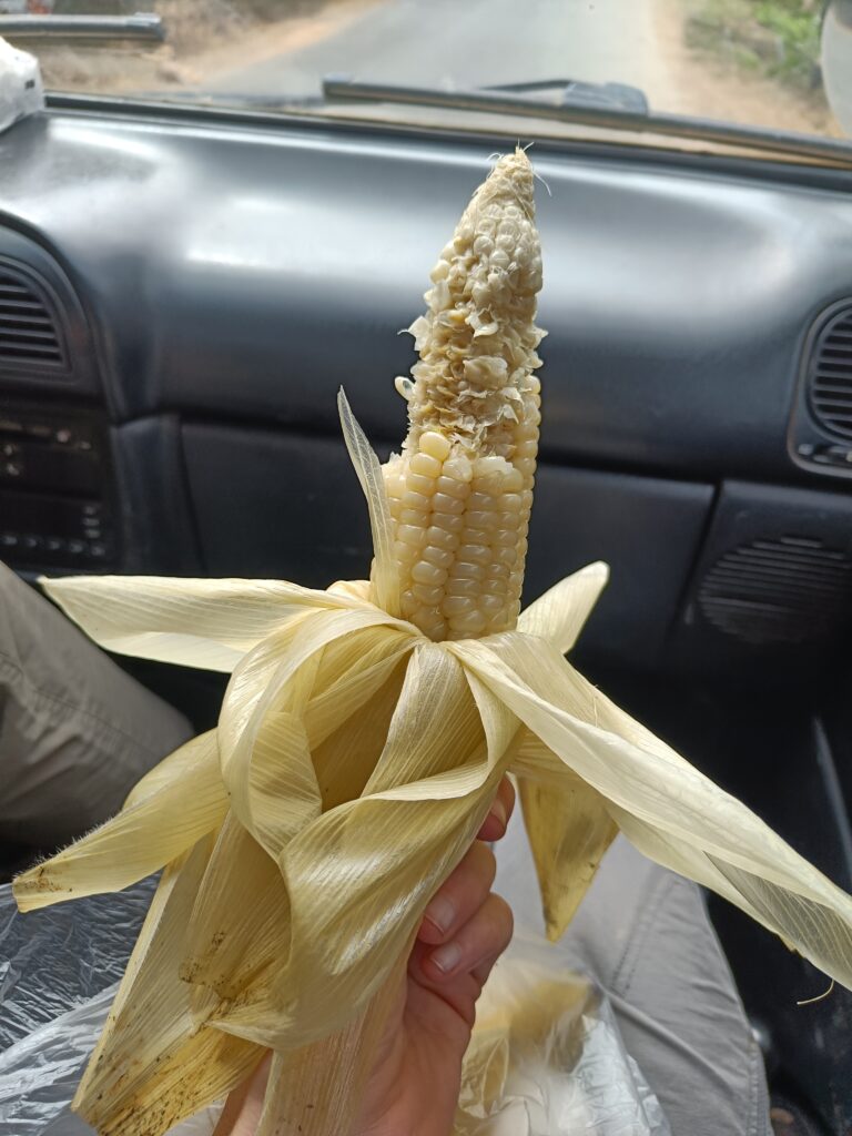 We’re determined to try hitchhiking, but it’s Sunday, so we’re hoping there will be trucks passing. We’ve found out that a thumbs up doesn’t work in Laos; you have to wave your hand in the air! While Audrey looks for an empty pickup or truck, Eloy gets ready to wave. The first one moves on… But after 10 minutes, the 2nd empty truck stops. Translating on the phone, we try to explain that one of us is sick and if we and the bikes can go with them. They gestured that it was OK and the woman immediately crawled into the back as we had to ride in the front. We load the bikes together and soon realise that even with a pickup these mountains are a torture. There is not a single straight stretch of road and at every bend there is a moped, a truck or a huge hole to avoid. Our driver drinks a can of iced coffee to stay alert. Communication is limited as neither of us speak English and our Lao is very poor. Using Google Translate, we try to say something to each other, but the man is quite enthusiastic and the road is a rollercoaster, so Audrey is afraid of distracting him too much 😉 He is driving very carefully, which we are not used to here. We share our bananas and a little later we get a corncob in return.