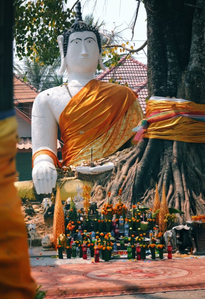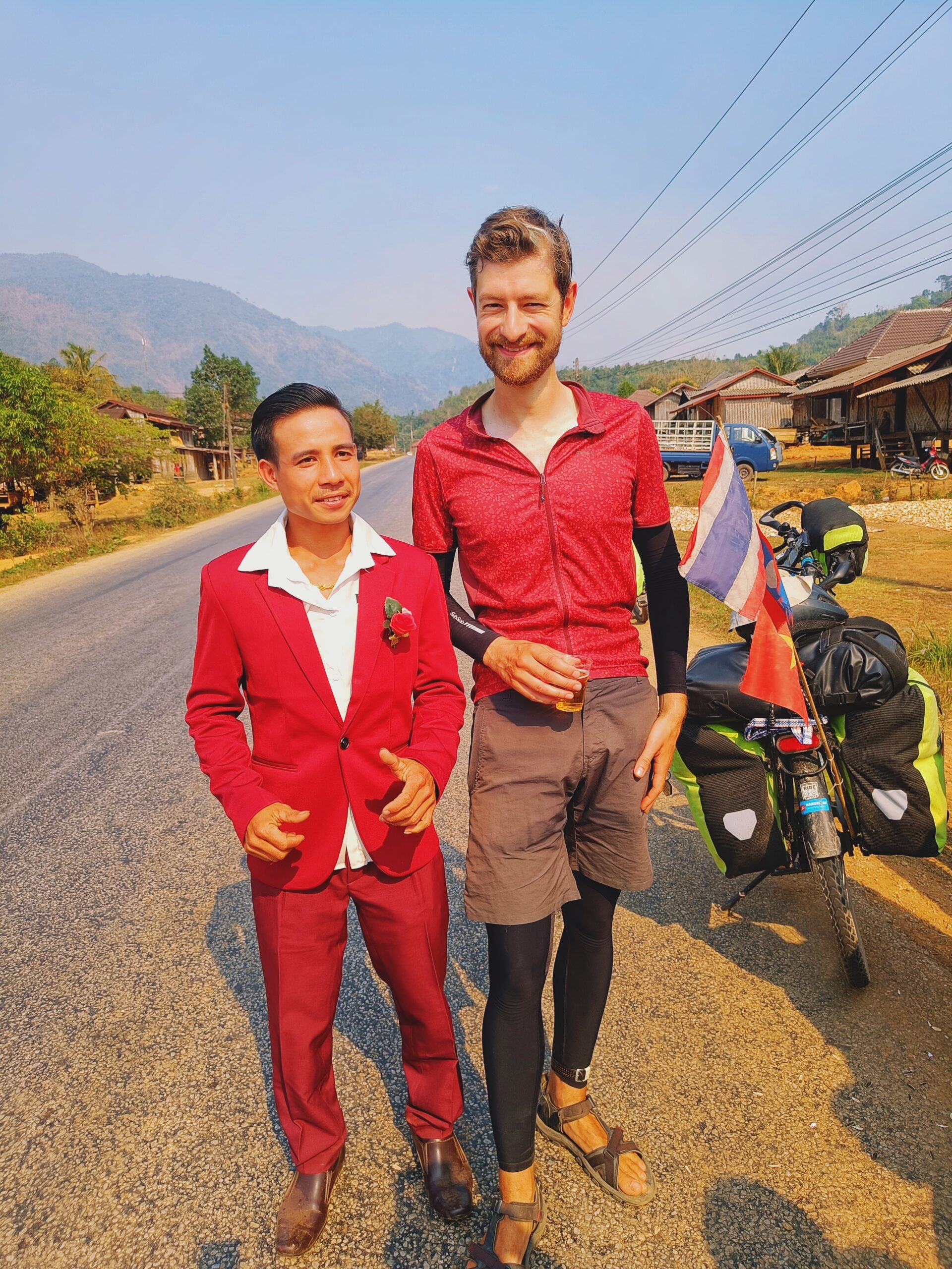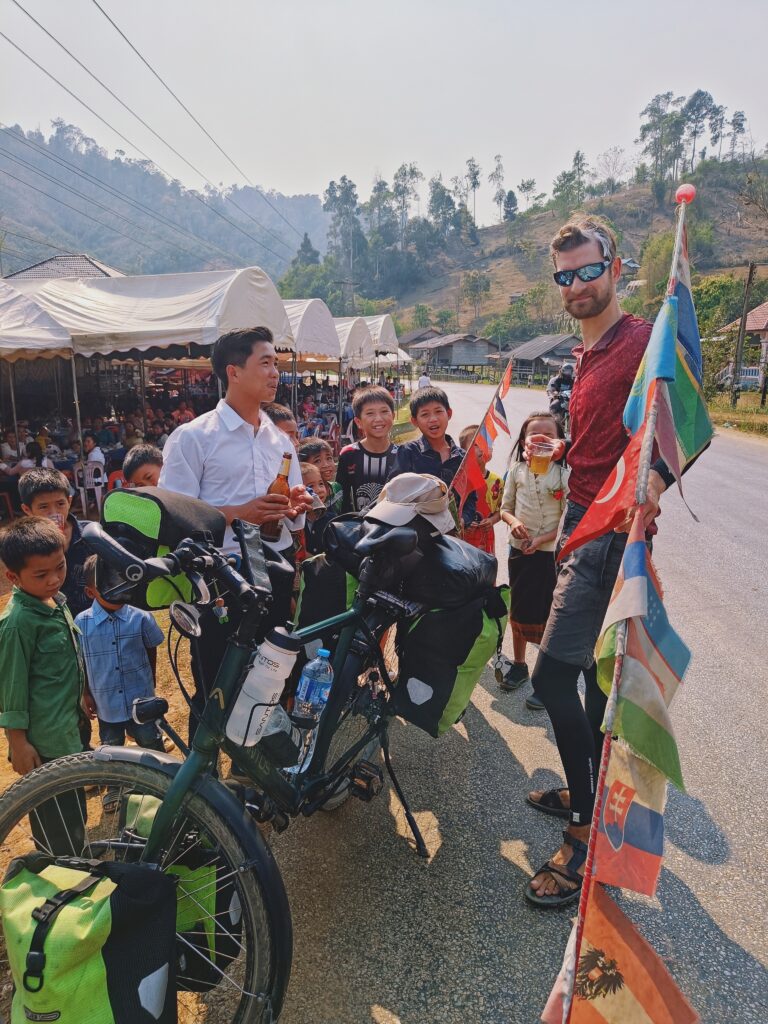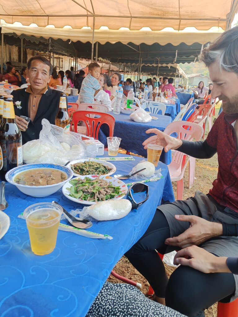 Weddings in Laos can be heard from afar. A cosy affair with loud music or karaoke, lots of people and often right on or next to the main road in a tent. As soon as we pass a wedding today, we are asked to stop. Immediately someone comes running with beer. And then the floodgates open. One guest after the other wants to be photographed, including the groom. The beer is replenished all the time, even though we point out that it is not necessary. We are led to the guests’ table and invited to sit down and eat. The food looks unfamiliar and considering that Eloy has just recovered from his intestinal problem, we don’t really dare. But we didn’t get the chance to either, as people kept passing by for a photo. We see an opportunity to signal that we are leaving and can barely comprehend what has just happened.