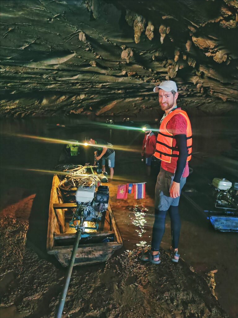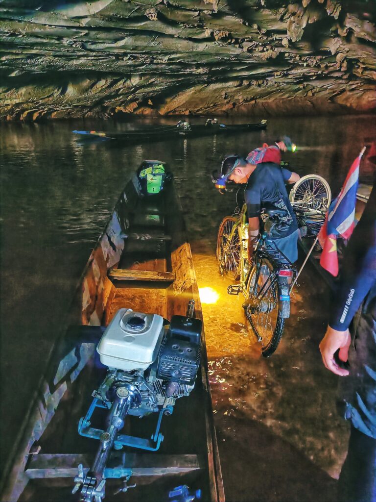 The next day we cycle to the limestone cave of Kong Lor. It is one of the geological wonders of Laos, 7 kilometres long and a river flows through it. We plan to continue the route on the other side of the cave, so the bikes join us on the boats. Actually 2 boats, Eloy in one and Audrey in the other. First some water is scooped out of the boats and then we sail into the darkness, armed with headlamps and life jackets.
