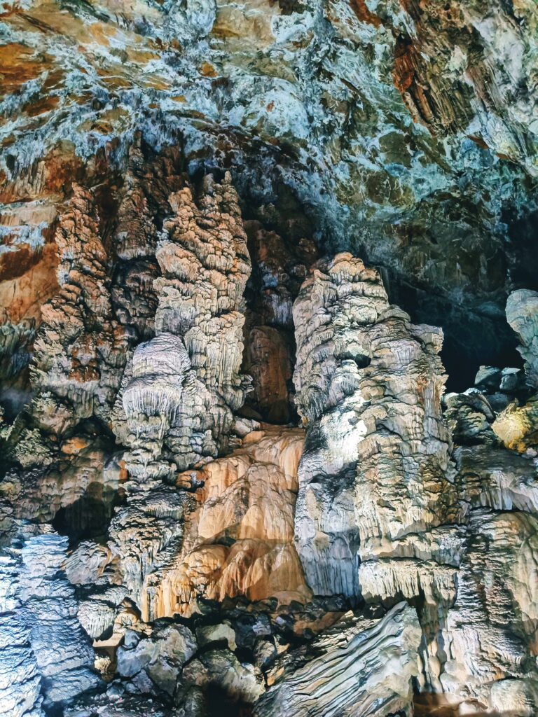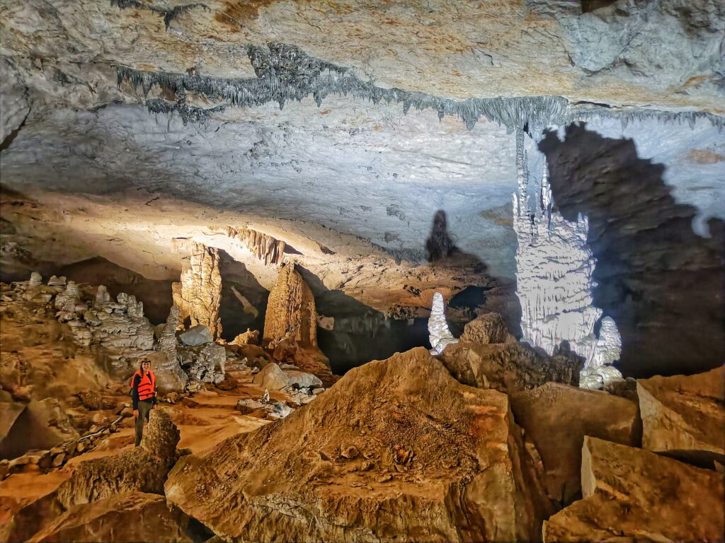 At certain points in the cave the boats stop and there is a chance to get out and see the huge stalagmites and stalactites up close. Eloy sinks into the mud and falls into the water against the boat, wallet included! We laugh nervously; the nearest ATM is 100km away. A little later, Eloy wonders why Audrey’s little boat is not coming out of the darkness. …. It has run aground and Audrey shouts, “We had to get out and push the little boat free”. What a heavyweight! The last part of the trip is a kind of rapids. The bikes, equipment and ourselves have to get off. The boats are pulled up by a rope and then we sail the last bit to the exit of the cave. It was an adventure and what an extraordinary cave. We have never seen such huge stalagmites and stalactites and the colours are unbelievable.