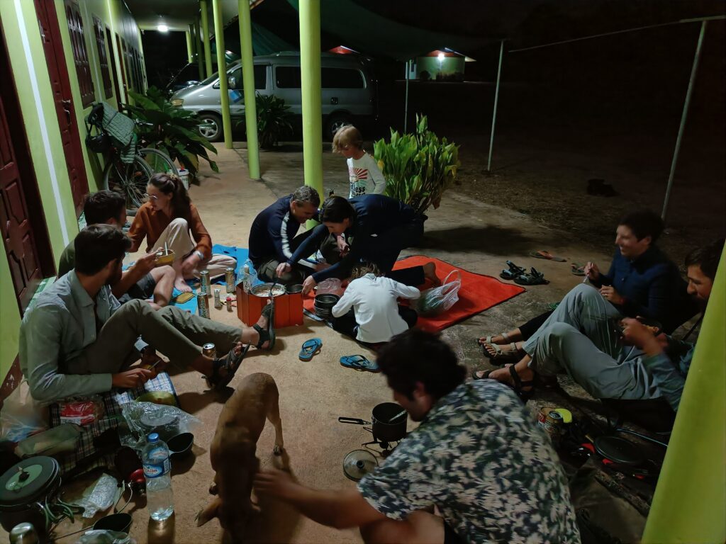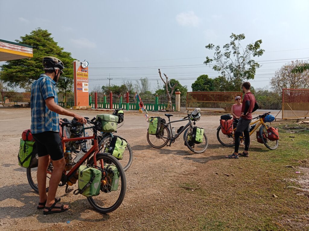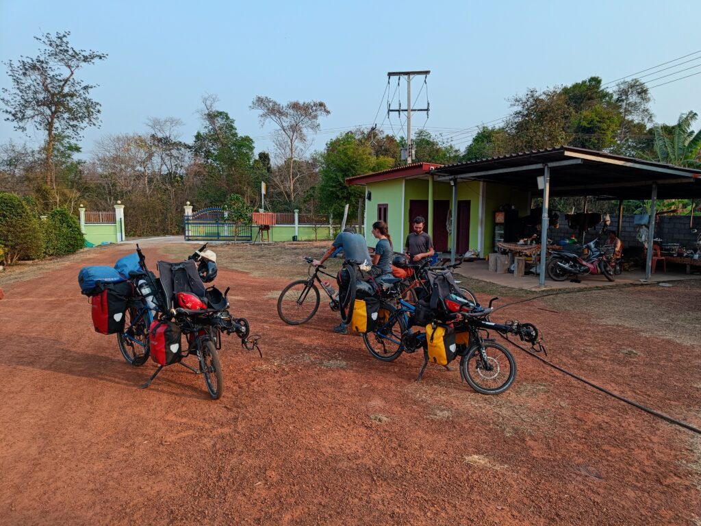 When all 5 of us are installed in the guesthouse, to our surprise, other cyclists arrive. A French family with 2 tandems and their 2 small children and a Swiss couple. On the way we also meet an elderly Italian couple. Yesterday we met almost no cyclists and today this! It might have something to do with the fact that there is only one road from central to southern Laos… and now we seem to be crossing each other. It is an evening full of stories and experiences, tasting each other’s food, sharing what there is to share, on the ground in front of the only guesthouse in the distant area.