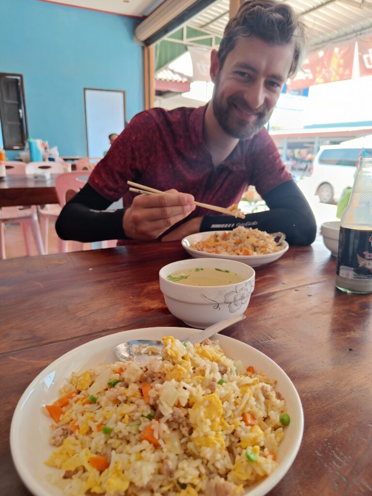 As we had a delicious waffle left over, we had it for breakfast, followed by a portion of fried rice. Then we jump on our bikes and head for the mountains. We know that the next few days will be challenging. Few facilities, bad roads and lots of climbing. At the end of the day we find a place to pitch our tent in a restaurant. A young woman is busy dyeing thread for weaving. There is a patch of grass next to a waterfall and the restaurant looks closed but is open. The famous papaya salad is especially spicy! Audrey had had enough after 2 bites and said her stomach couldn’t take it. Eloy ventures in anyway…. Later in the evening, the family invited us to join them at their table and we ate all sorts of irreducible things. The spiciness takes its toll a little later when we are in the tent. Eloy’s guts sound like a spinning washing machine and he leaves the tent every hour to vomit.