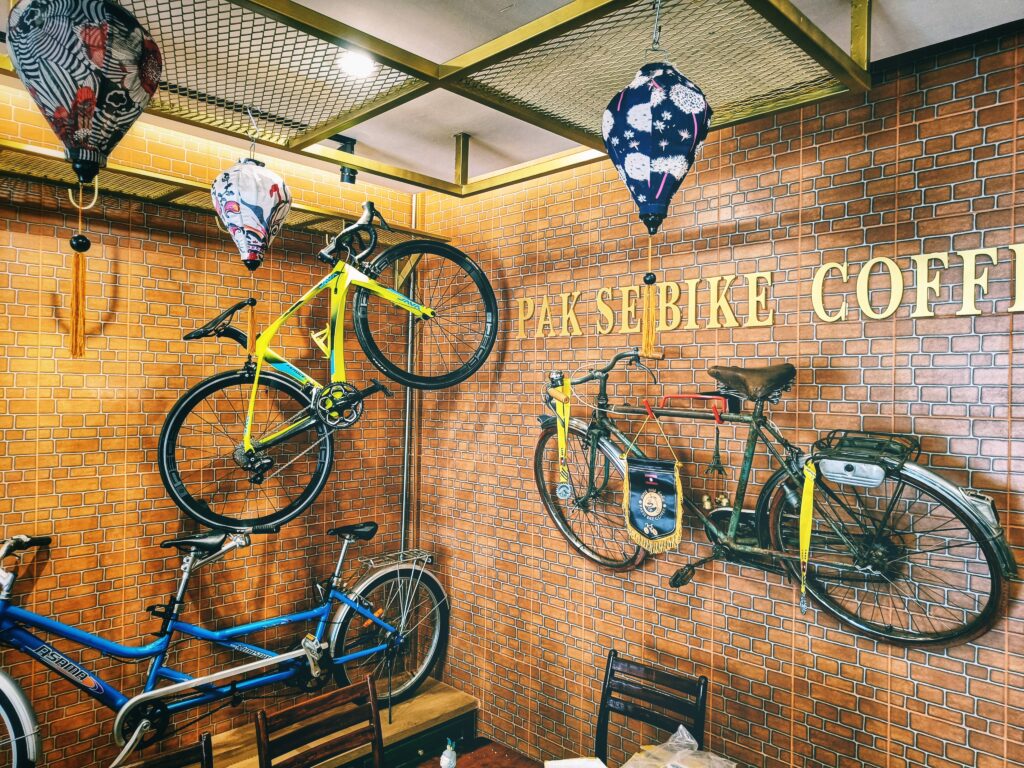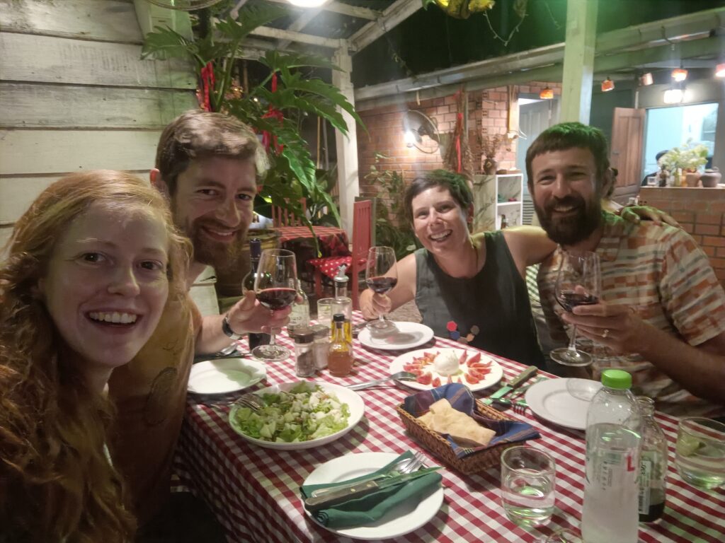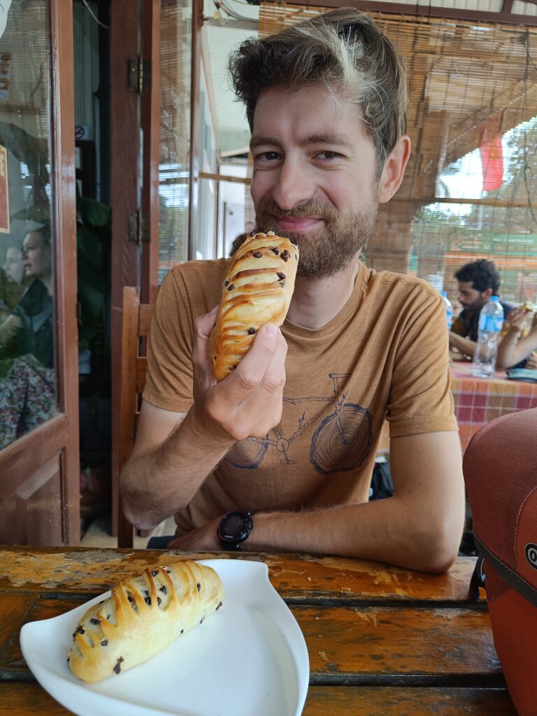 We are so happy because it is Eloy’s birthday and we are celebrating it with: food! Chocolate buns, coffee and chocolate mousse. We walk around Pakse a bit that day and to escape the heat we look for a place to sit inside. Suddenly we see a bicycle hanging from a cafe, so we go in. It’s an old military bike hanging on the wall and it doesn’t take long for the owner to spot us. He had only opened this year and was very keen to have his photograph taken. Moments later, we are photographed and to our surprise, the photo is printed on the coffee! Eloy also gets a food gift from Bron and Renée: Lao coffee and a big jar of peanut butter. As it is the last day we will see them, we go out for dinner together. Italian, with a real Italian manager. The red and white checkered tablecloths, with pasta and cheese as only real Italians would prepare it.