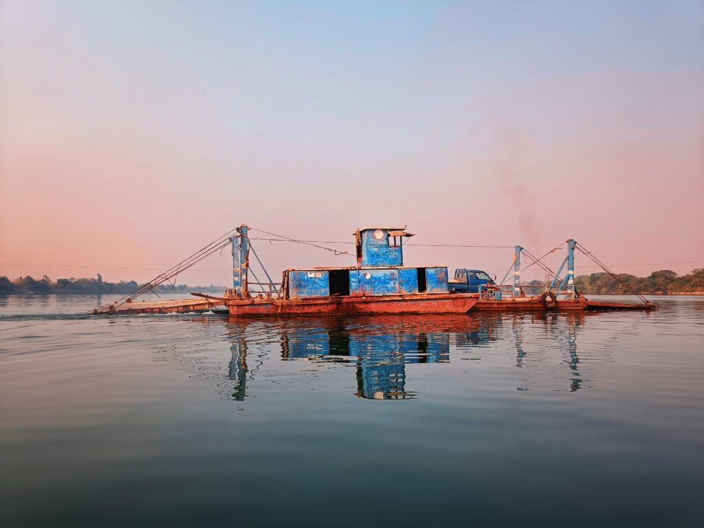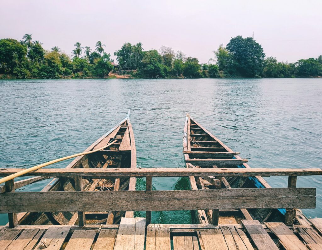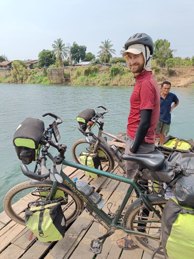 After 2 days in Pakse we get back on our bikes. We cross the Mekong and follow it further south. Shortly after leaving the city, the tarmac ends and we are on orange sand and gravel roads. We have lunch in the only village we pass through and then it is a short distance to a ferry. But the ferry, which appears to be in a state of disrepair, is not for cyclists. Cyclists travel on a separate wooden boat.