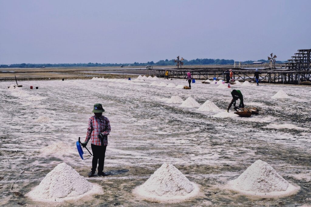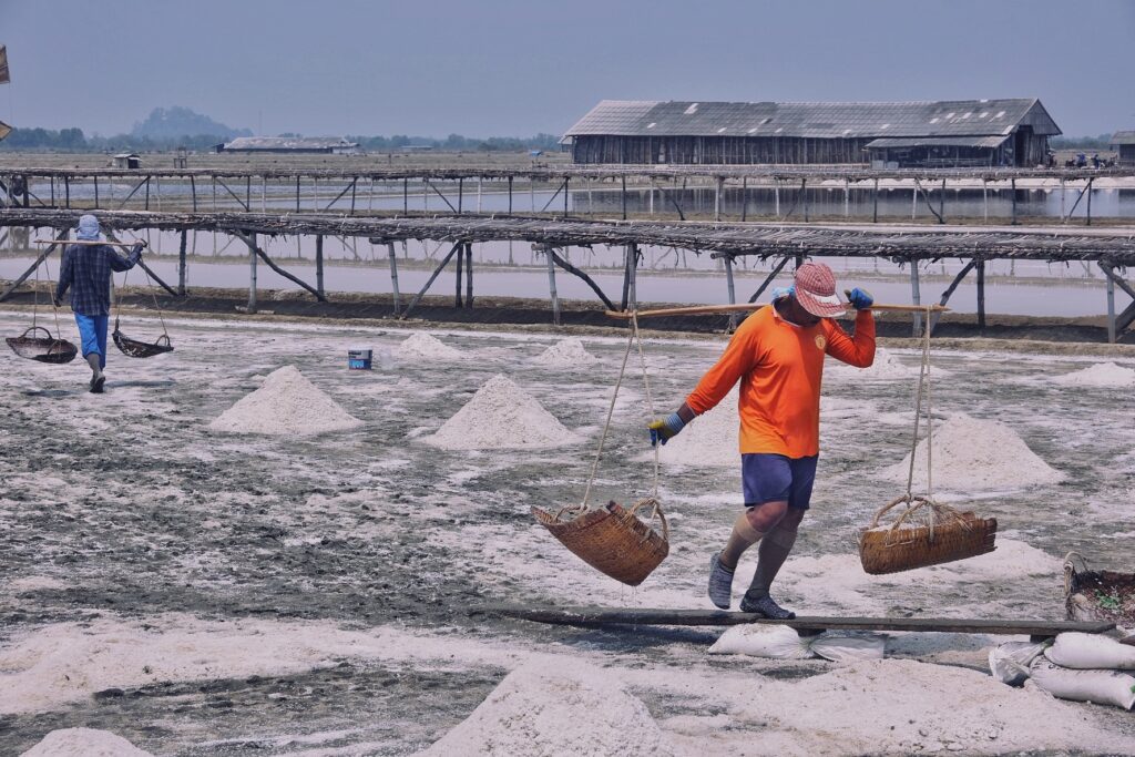 The stretch we cycle today is partly along a busy motorway. We have to take steep steps to cross the motorway, and later we pass through a large salt mining area. Sea salt is mined in the scorching sun during the dry season. About 10 per cent of the salt ends up on tables, the rest is used in other industries. Workers are busy collecting the salt and carrying it away in bamboo baskets, balancing on a narrow piece of wood. To do this work, in this heat, on a bright white reflecting salt pan, is unreal.