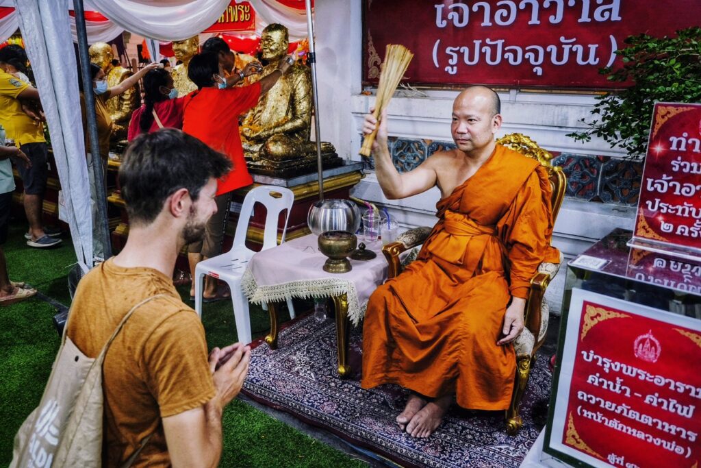 During Songkran, people spend a lot of time with their families. They visit temples and make offerings of food and water. Eloy is being sprinkled with water by a monk. Hopefully it will bring good luck and prosperity to his bowels. We also see many people with some kind of white paste on their faces. This is one of the oldest Songkran rituals. An older person will usually smear the paste on a younger person as a sign of protection. Of course, it also ends up on our faces, bicycles, cars, etc.