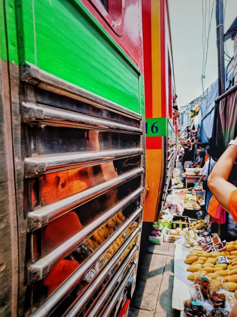 In Mae Klong we spend the night in a small but very nice hostel with air conditioning, plus breakfast for 6 €, for 2 people… Our neighbour turns out to be an elderly man from Canada who is also cycling in Southeast Asia. The heat seems to be playing tricks on him. The next day we visit the Maeklong Railway Market. It is one of the biggest fish and seafood markets in Thailand. The market has been around since 1905 and sells a lot of fruit and vegetables as well as fish. Later the railway line was built to distribute the products faster. Now a train passes through the market 4 times a day, literally. It is a bizarre sight. A few minutes before the train passes, all the tarpaulins and stalls are folded down and any obstacles that are too high are removed. The boxes of fruit and vegetables on the ground just stay there, disappearing under the train as it passes. You can touch the train with your nose, but we didn’t try.