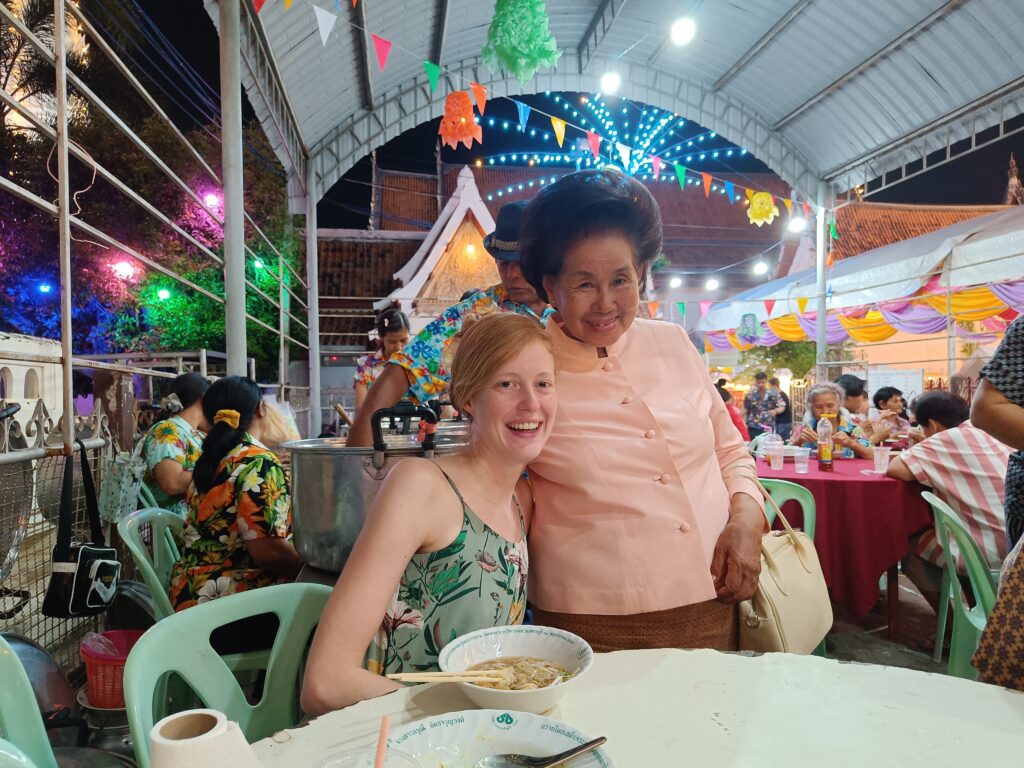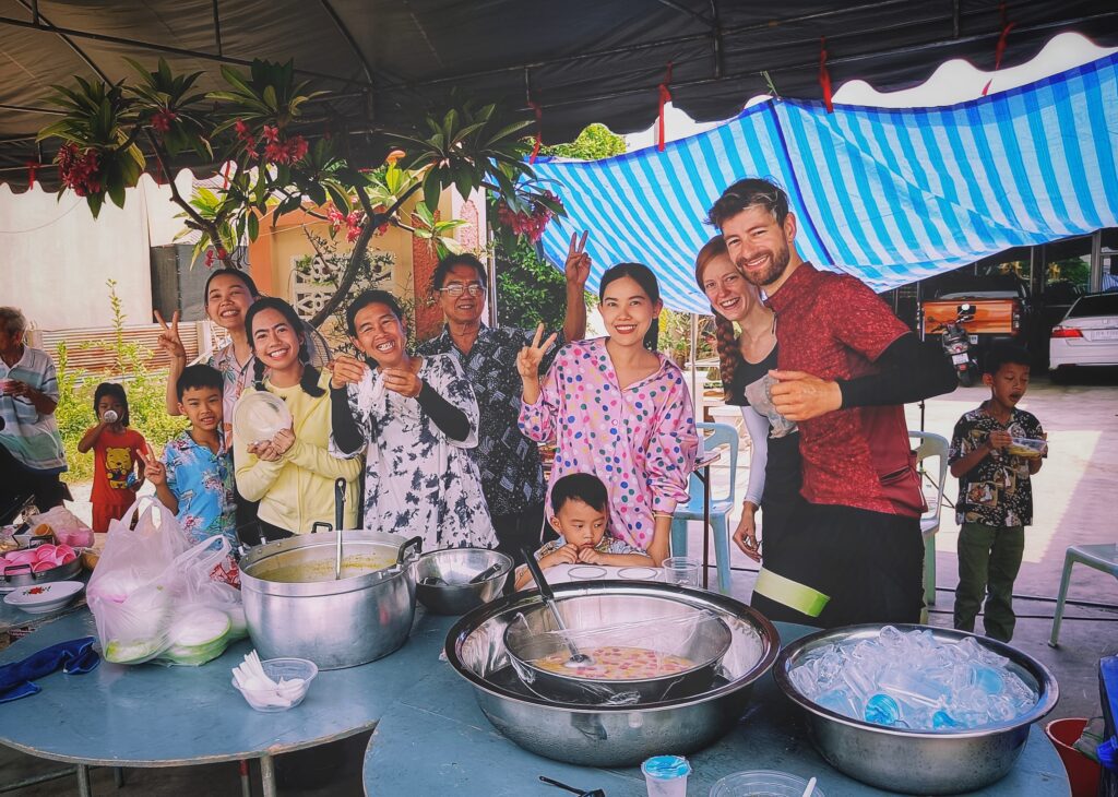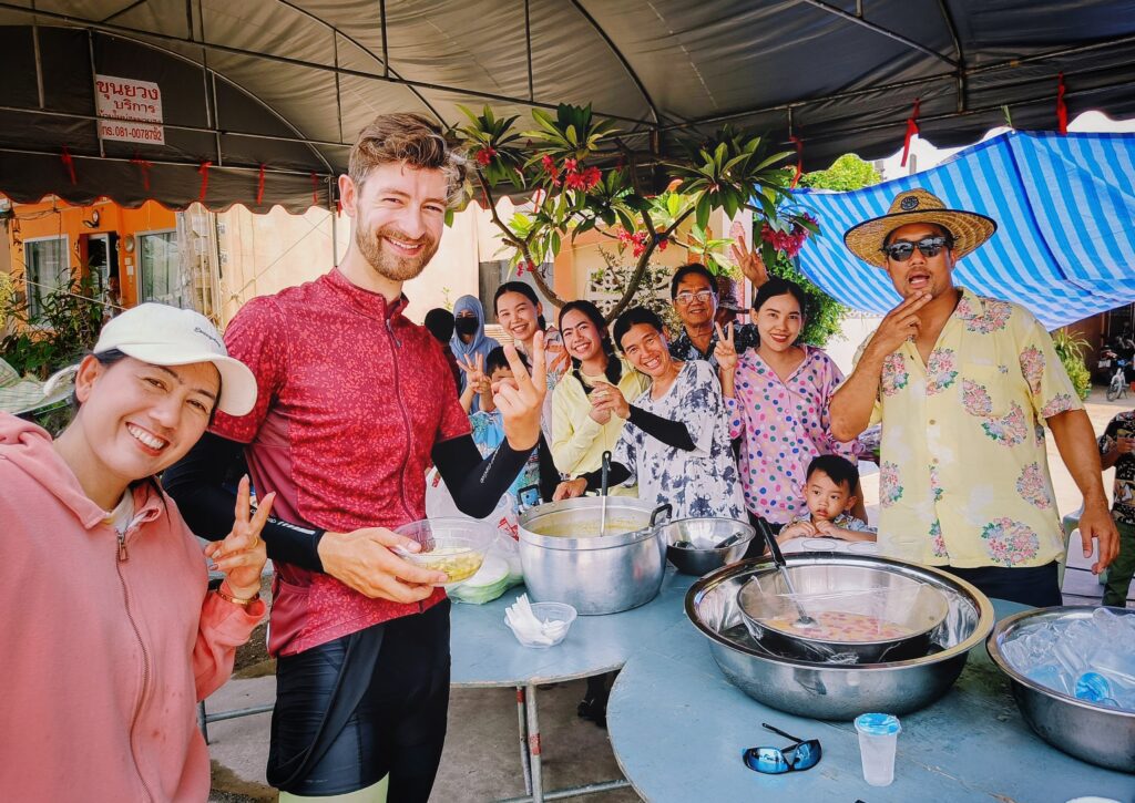 There is even a place in Petchaburi where anyone can come and eat for free. An elderly Thai lady donates money so that the whole community can enjoy a tasty meal. The women at the table can’t stop laughing as we try to eat the noodles with our chopsticks.