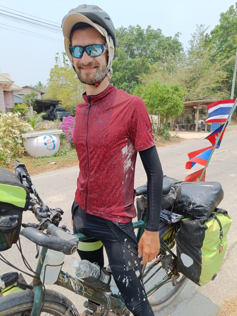 The next morning Eloy hears someone panting behind him as he sits on the toilet. It turns out to be one of the stray dogs taking shelter from the heat on the toilet next door, drinking water from the same barrel we used to wash ourselves yesterday. Before we leave, a vendor brings us 2 more bottles of water. It promises to be another hot day. Before we know it we have to stop 3 times within 5 km. The wind chill rises to 45°C. This is April, the hottest month of the year in Thailand, with a normal (!) average temperature of 35°C.