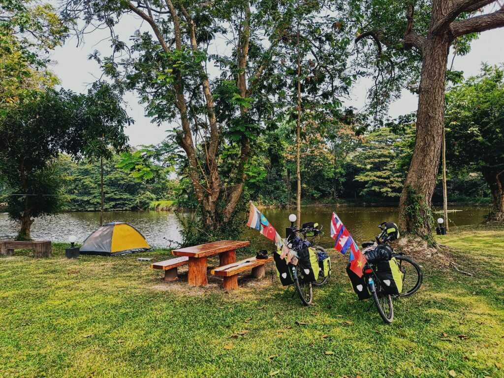 After a day of cycling along the coast, we arrive at Pran Buri Nature Park. It is on the coast and there are still a dozen or so tents owned by local people. It has a cosy atmosphere.