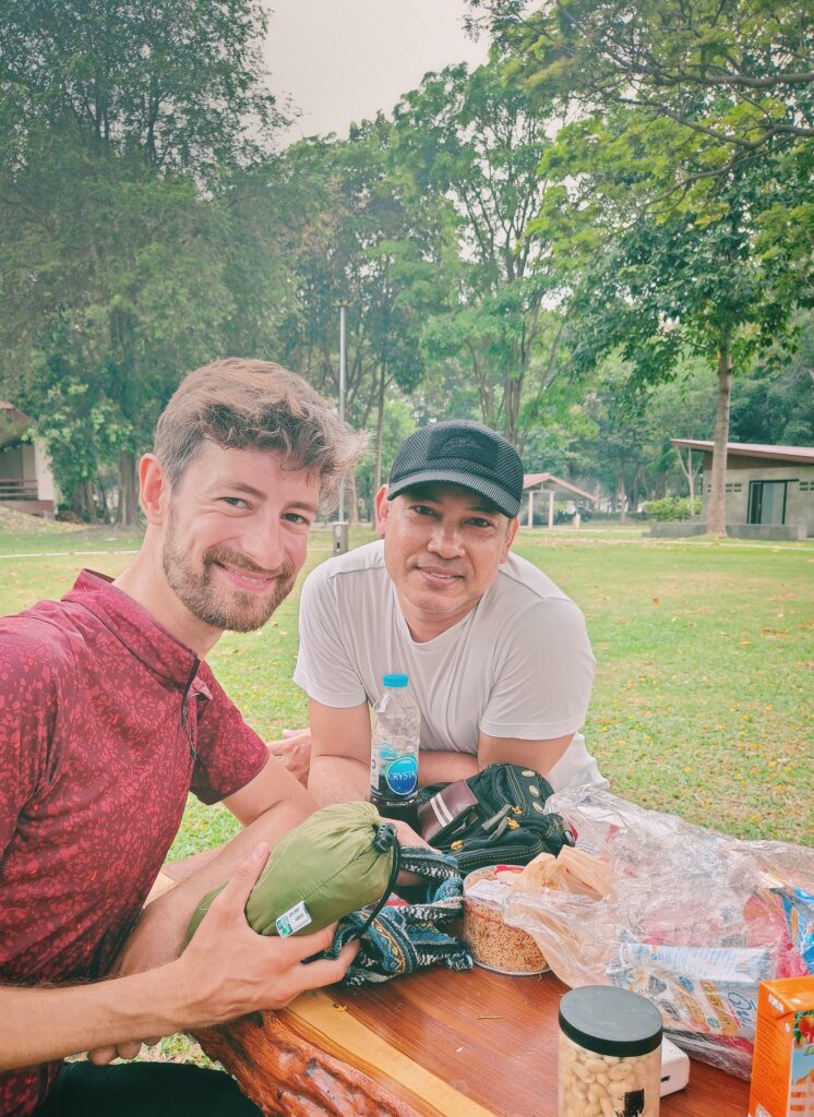 Sometimes there are Thai people in the campsites, and it doesn’t take long for them to come over and have a chat out of curiosity. In Cha-Am Forest Park, a Thai motorcyclist camps next to us. In the morning he joins us at a table and kindly asks if he can make a video. Then he went back to his tent. At the same time, a woman comes to the table and hands us a bag of biscuits, drinks and snacks. A few minutes later the motorcyclist comes out of his tent and says: “I have 2 hammocks, I only need one and I want to give it to you!” He is at the end of his motorbike trip and wants us to take him with us. Along with bags of instant coffee and a handbag. Once again we are at a loss for words.
