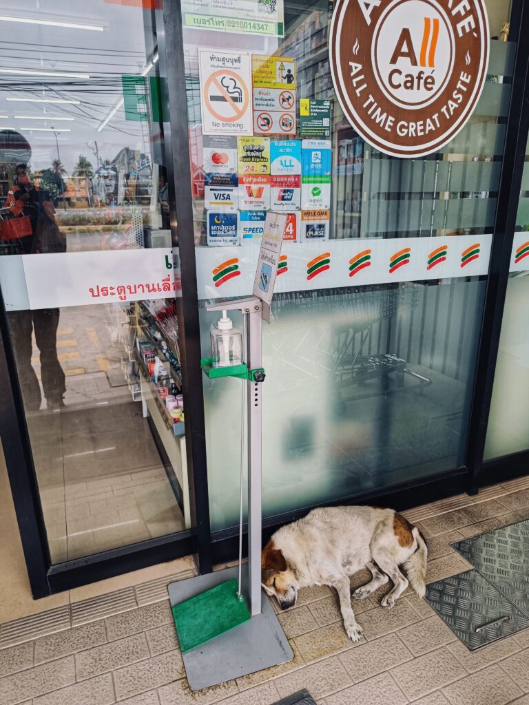 Today is the day! After 3 months we hope to make it back to Bangkok in one piece. With a population of 10 million, the traffic 80km from the city is maddening. It is unbelievably hot and the heat radiating from the cars and the asphalt is almost unbearable. We cycle from 7-Eleven to 7-Eleven to cool off. 7-Eleven is a supermarket chain of which there are 11,700 in Thailand, sometimes as many as every 500 metres. They are open 24 hours a day and never close, with 44% of all stores in the Bangkok area alone… Dogs and cats also use the air conditioning.