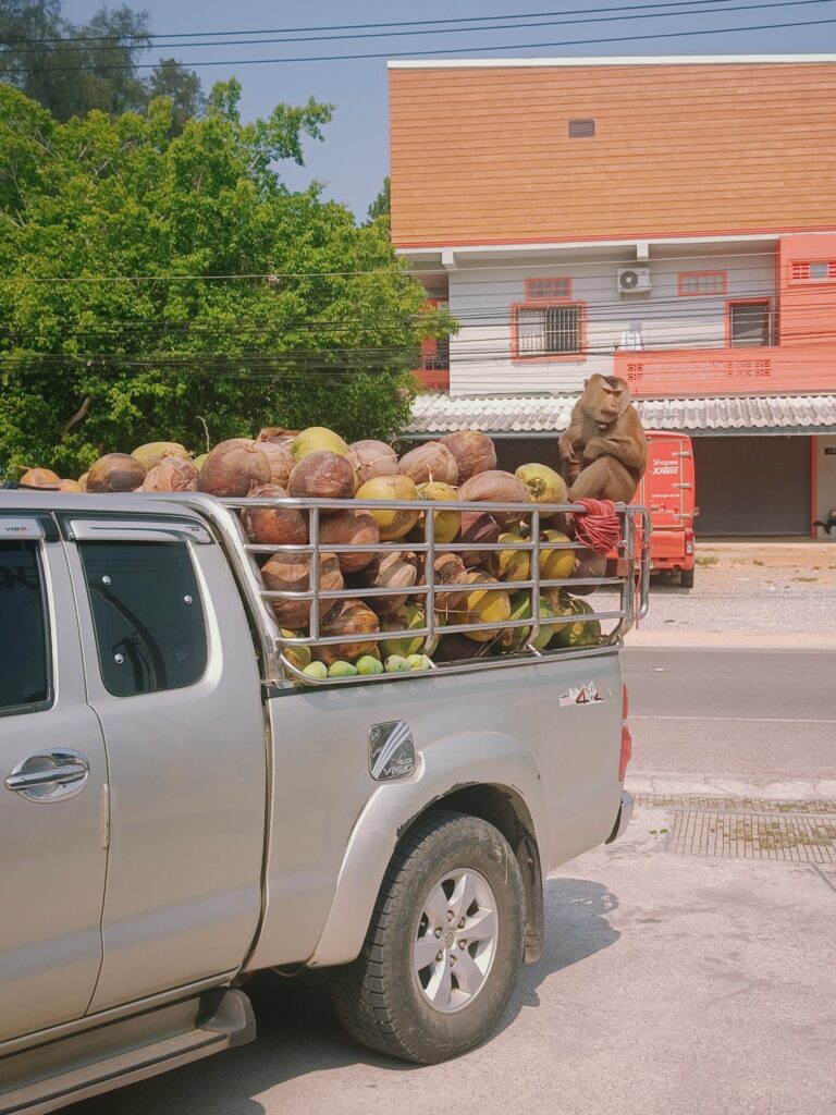Then there are the coconut plantations. Palm trees grow hundreds of millions (!) of coconuts every year, but Thailand consumes even more. It also imports from neighbouring countries to make coconut milk, oil and so on. Some farms use macaques (monkeys) to harvest the coconuts. They can pick about 1,000 coconuts a day, much more than a human. This method of harvesting has been used for more than a century, although in recent years there have been increasing questions about animal welfare on some plantations. We regularly see a car or scooter pass by with one or more monkeys sitting on a pile of coconuts. The monkeys are usually tied up.