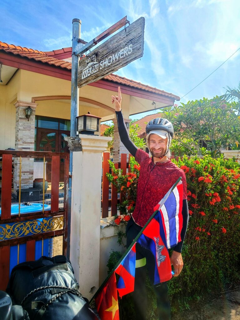 We drive on to Di. A Thai woman we contacted through Warmshowers. When we arrive, she leads us up a flight of stairs to a hut and then takes us into a local restaurant. She explains that she had seen several cyclists heading to or from the border and wanted to help them, so she joined Warmshowers. “Everyone is welcome here”, she says. After all her stories, we want to pay for the food, but she refuses, saying: “Because you are my heroes“. We reply in kind: “You are our hero!” Back at the house, the neighbour also grilled corn and hung it on the door of our room. Incredible!