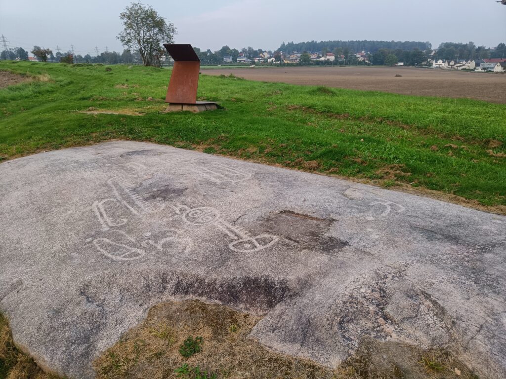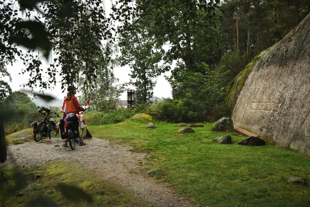 We have some trouble finding a remote place to sleep, but at one point we cycle past a farm until we reach some more remote fields. There is a sign with some information. A little further on, there are indeed engraved rocks from the Bronze Age (about 3,000 years ago). There appear to be ships, footprints and circles of unknown meaning carved into the rocks. The footprints may symbolise possession, but could also represent a journey. The words for death and movement are linked in many ancient European languages. For example, deceased people are often described as having ‘gone on a journey’. Images that express movement can therefore be associated with both life and death.