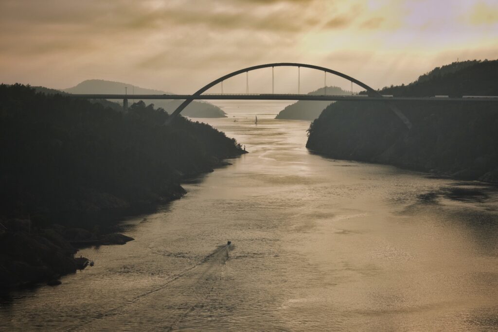 We continue into Sweden over the old bridge that links the two countries. In the distance we can see the new Svinesund bridge, which is only open to cars. Villages and places just before and after a border are always a bit special. Sometimes they seem deserted and abandoned, and sometimes, on the contrary, there is an incredible amount of life. Today we stand there with our eyes wide open. No houses, but huge hypermarkets and Islamic shops and it is nice and busy. We see many Turkish families, they see the Turkish flag and are only too happy to shout and roll down their car windows to give the thumbs up. Norwegians also come here on Sundays, as Sweden is much cheaper than Norway. Cars with Swedish licence plates are hard to spot. It is an unusual scene, but we cycle on quickly to avoid the crowds.