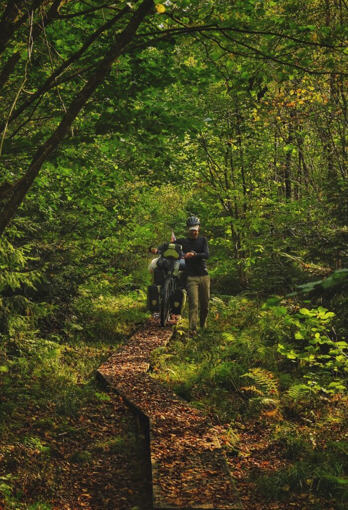 Further on, we duck back into the forest. We are looking for a shelter run by the local church community. Getting there is a challenge, and as Eloy battles mosquitoes, flies and bugs, he drops his bike in frustration. But the view and the sunset make up for it, he says later, grinning.