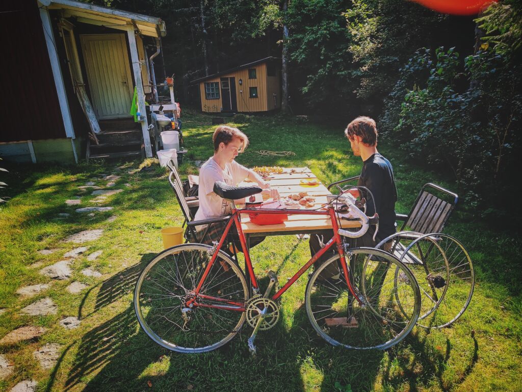 Over the next few days we paint as much as we can between showers, prune trees, cut the grass and Eloy helps Lotta clean her mobile phone. Something he knows from home and has done many times before. The fact that our arm muscles have completely melted away while cycling is painfully obvious after gardening…. When Lotta goes to Stockholm for a few days, Bertil takes care of lunch and dinner. He is a bit nervous about it and asks, full of doubt, if we like “matje” with rye bread. He does not know the English translation, but it turns out to be “maatjes”, or herring. That we are getting closer and closer to the Netherlands is evident in our culinary preferences. We eat pea soup, knakworsten and more potatoes in a week than in the whole of last year put together. After lunch, Bertil proudly shows off his ‘snickarbod’, or carpentry workshop. In the evening he makes mashed potatoes with sausage and mustard, then invites us to the fireplace for more stories.
