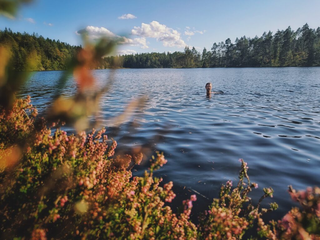 On the second day, together with a friend of Angela’s, we will paddle her homemade raft to a small island. The island is literally littered with red cranberries. Bizarre! “There are soooo many this year!” they keep saying. Skinny dipping in the lake is also a must. Audrey brings the cinnamon rolls and Angela the thermos of tea. According to them, we are really settled in Sweden now: a dip in the water, fika (see below) and picking berries and mushrooms.