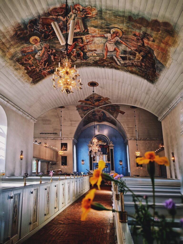 After five days of work, it is the weekend and the couple invite us to the Sunday service. This time to give thanks for the harvest. We understand little of the spoken Swedish, but have plenty of time to admire the impressive paintings on the wooden ceiling. After the service, there is a fika moment for all churchgoers. Coffee is served at the back of the church and it remains something special to see. As if that weren’t enough, we are then taken to a local fishmonger. There are eight tables in a small caravan. Small pieces of all kinds of fish are served on plates, many of which we haven’t yet identified.